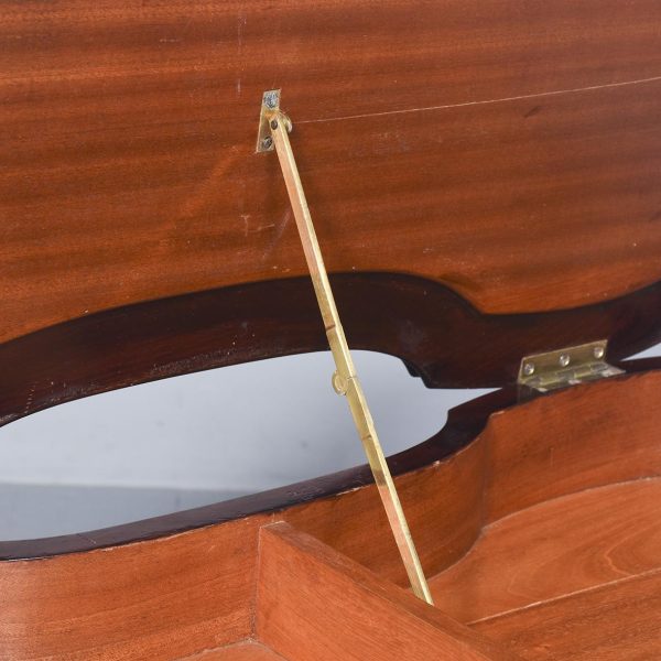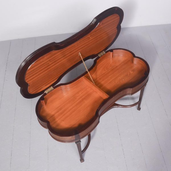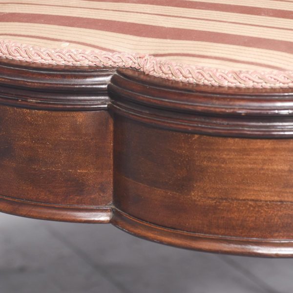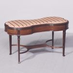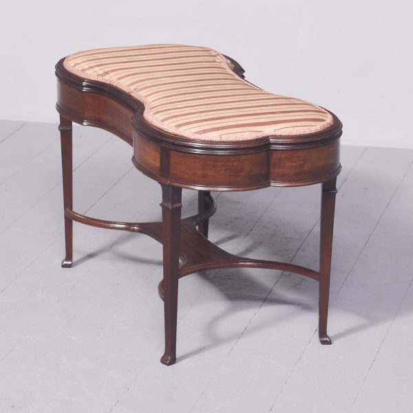 Circa 1900 An unusual stylish mahogany framed duet stool the shaped, hinged upholstered top opens to reveal 2 storage sections, the shaped frieze follows the form of the top, with a moulding on the and top beading on the bottom, the stool rests on 4 elegant square tapering legs with foliate on the top intersected by stylish curvaceous stretcher with a small shelf in the center finishing on a splay toe