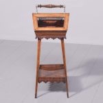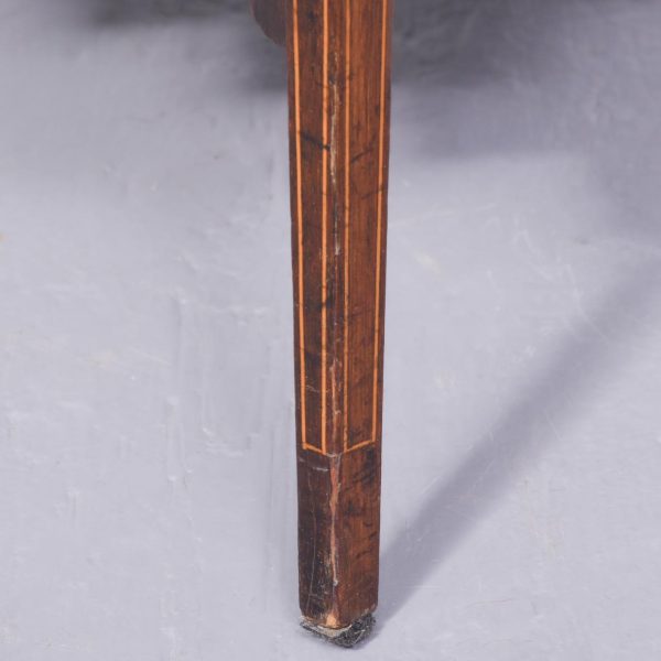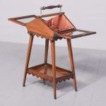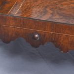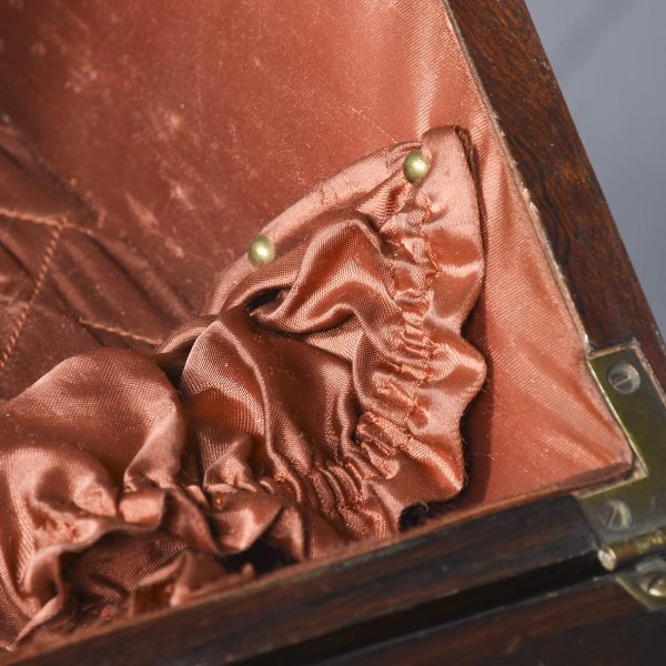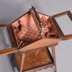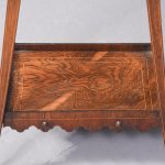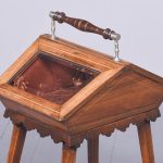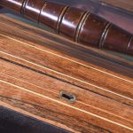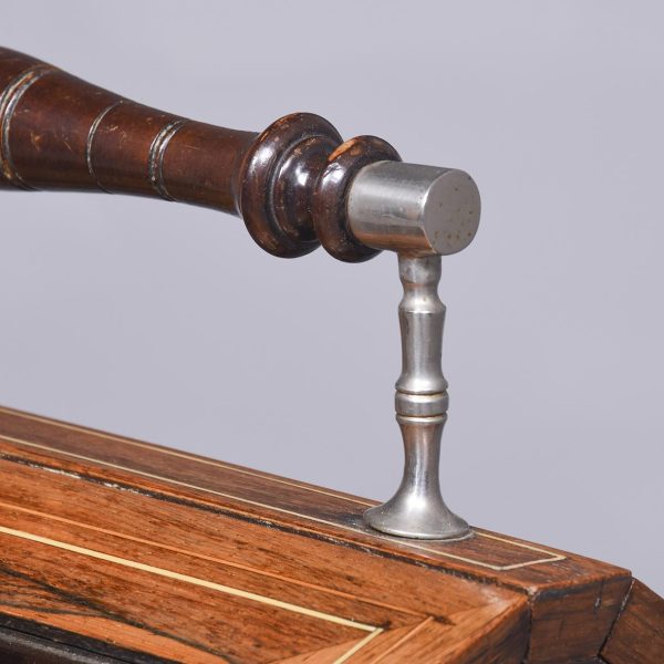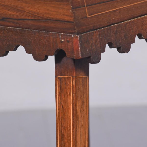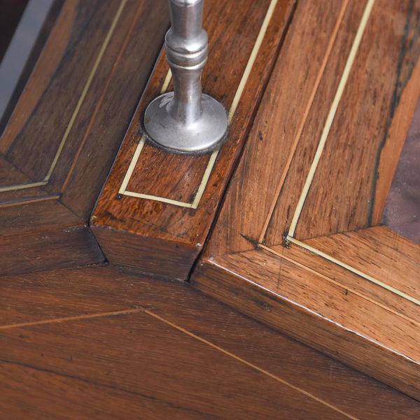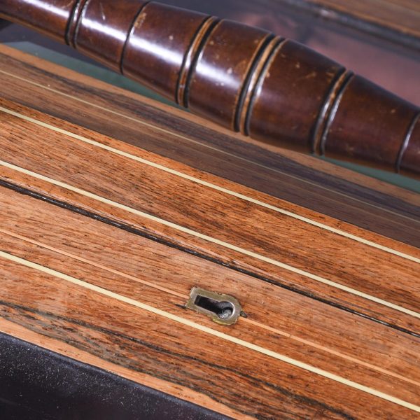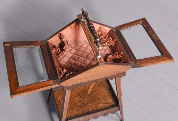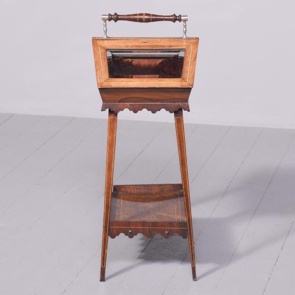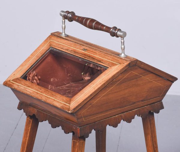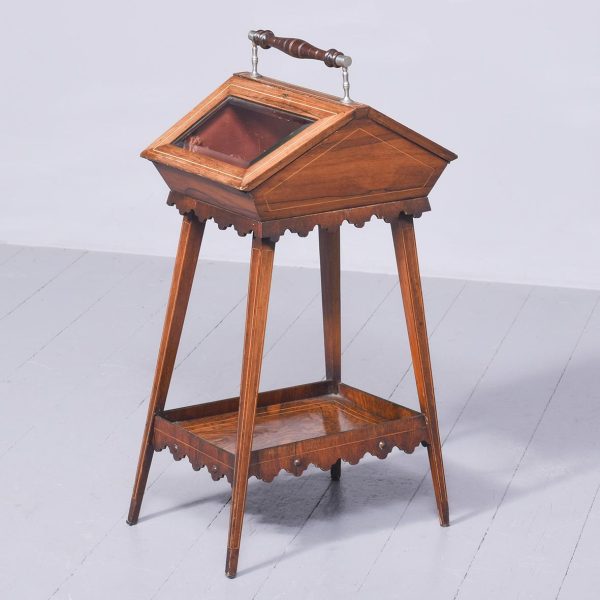 Circa 1890. A late Victorian rosewood and inlaid glazed sewing box, the top with turned lifting handle and two sloping glazed lids, one with a secret compartment, with string inlay with a shaped and carved frieze, the table rests on four square tapering splayed inlaid legs, the base with an inlaid shelf with a frieze similar to the top.