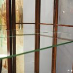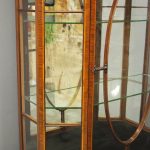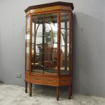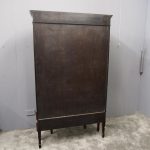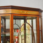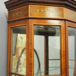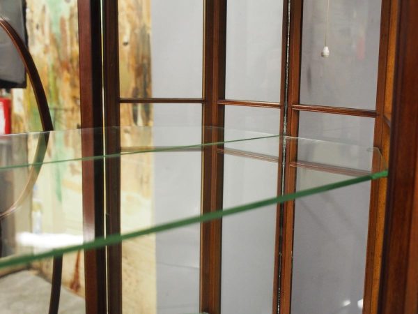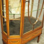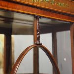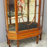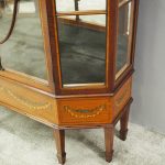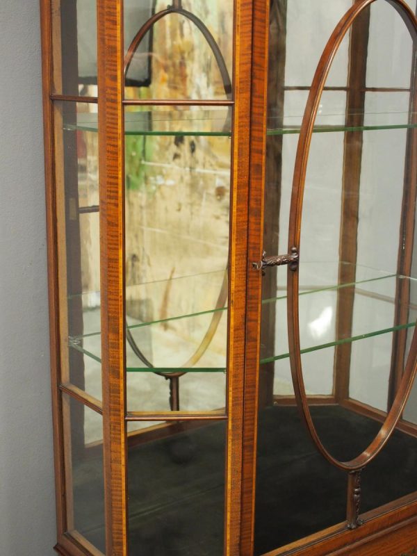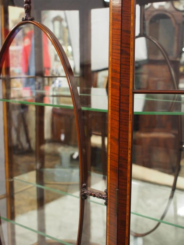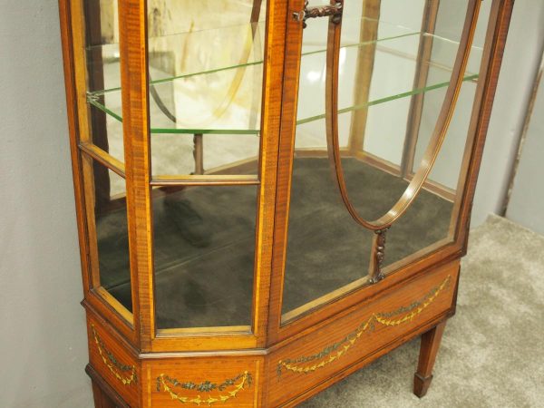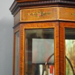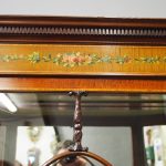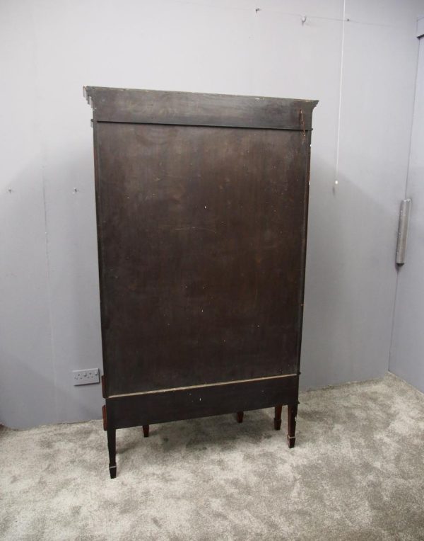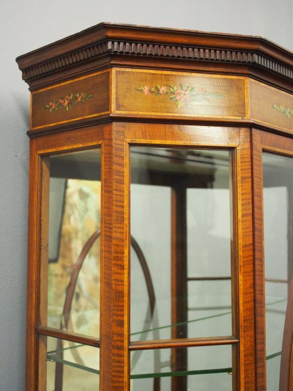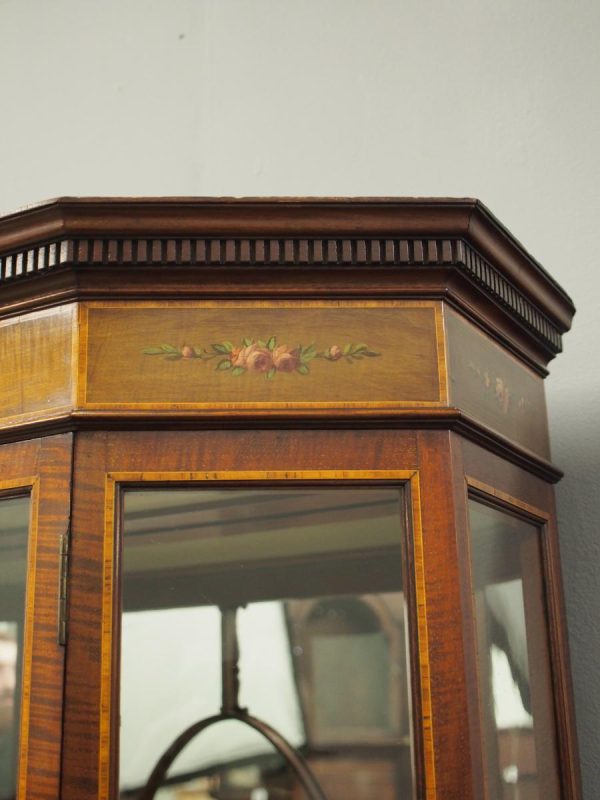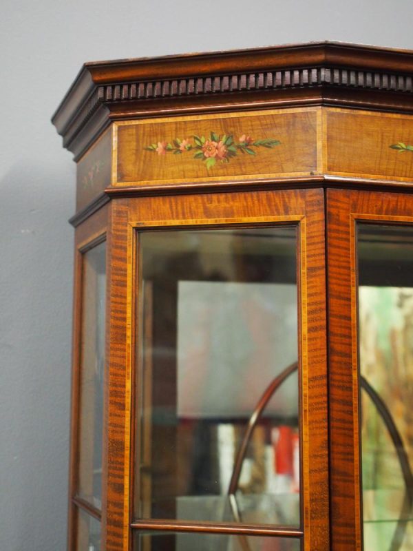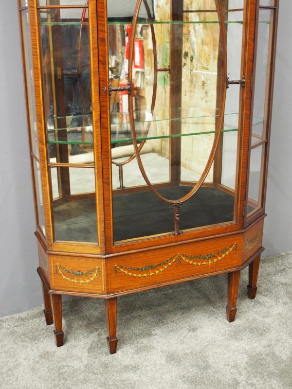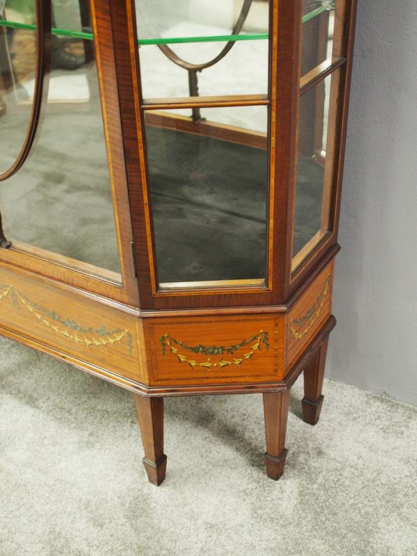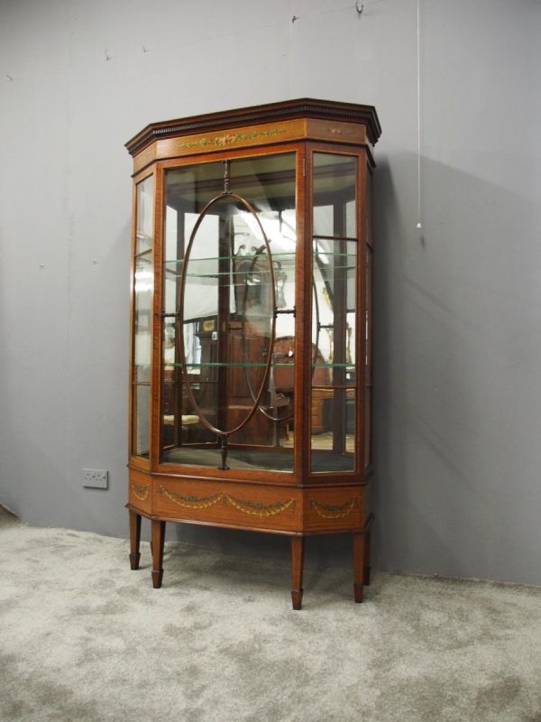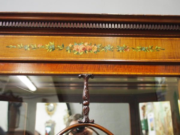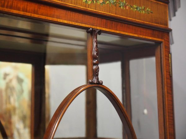 Circa 1900, Sheraton style inlaid and painted display cabinet. With moulded, dentil style cornice above a painted panel and with large glazed door with oval panel and foliate astragals. Inside is a mirrored back with 2 glass shelves, and glazed gables. With a deep apron, painted design of swags and tails and standing on inlaid, tapering legs and raised toes.