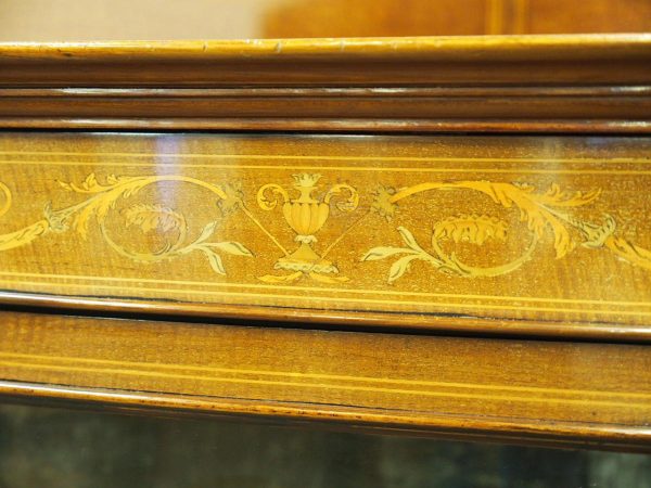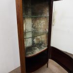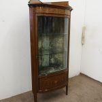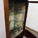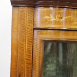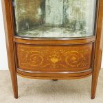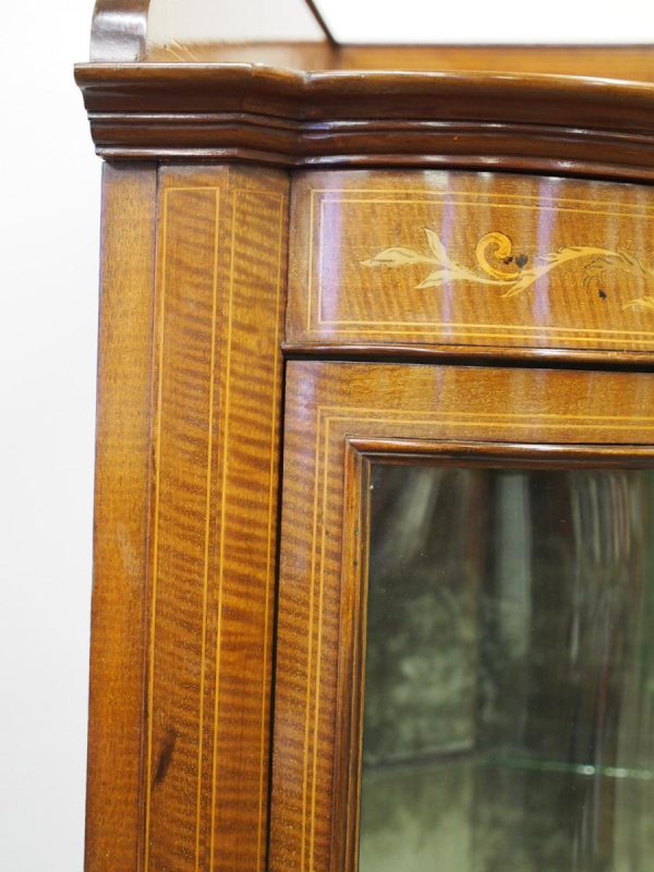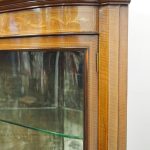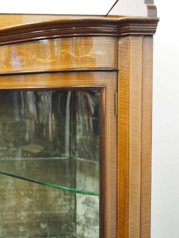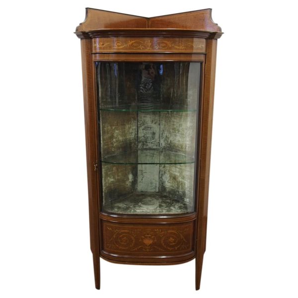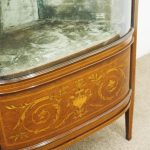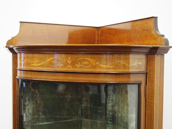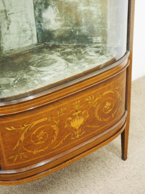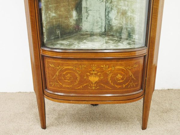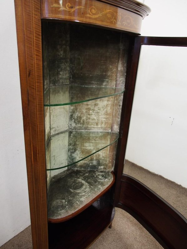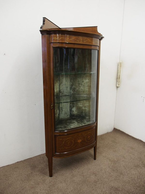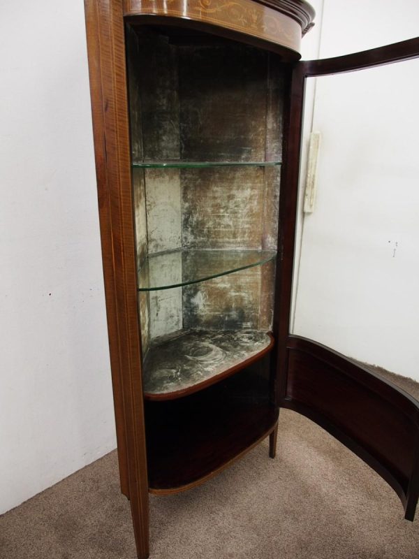 Circa 1900, Sheraton style mahogany and inlaid bow fronted display cabinet. With V shaped gallery to the back crowned to the top with double string inlay, and the front has a shaped frieze with Sheraton style inlaid decorations. The full length door below has curved glass, and opens to a silk velour-lined interior, and two plate glass shelves above a felt-lined shelf with mahogany facing It has a gilded brass escutcheon and beneath the door is a marquetry panel leading on to tapering legs to the front and sturdy feet at the back.