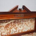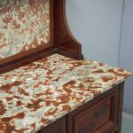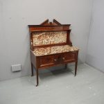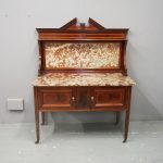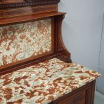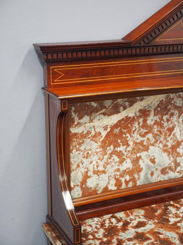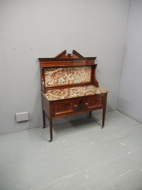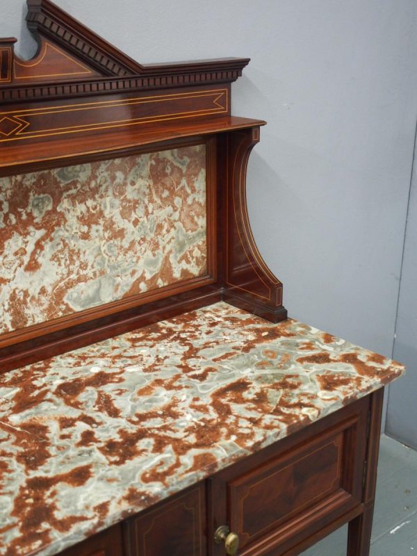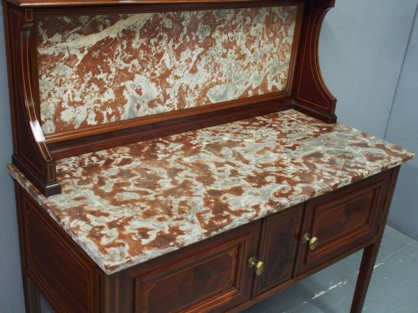 Circa 1890, exhibition quality Sheraton style mahogany and inlaid, marble topped wash stand. The raised back has an architectural pediment with boxwood inlay and a shaped shelf with a moulded edge, with the top and back splash in red and grey mottled marble. Beneath are 2 cupboards with inlay doors and oval cast brass handles. Standing on 4 tapering legs with further string inlay and brass cups and brass castors beneath.
