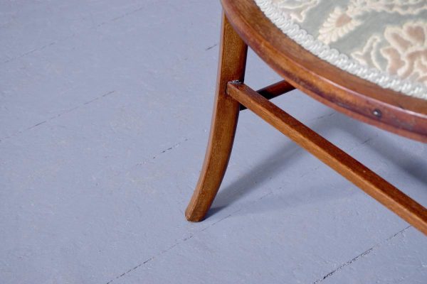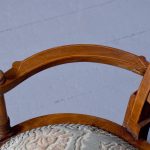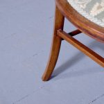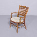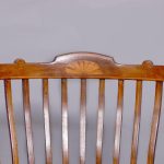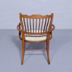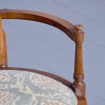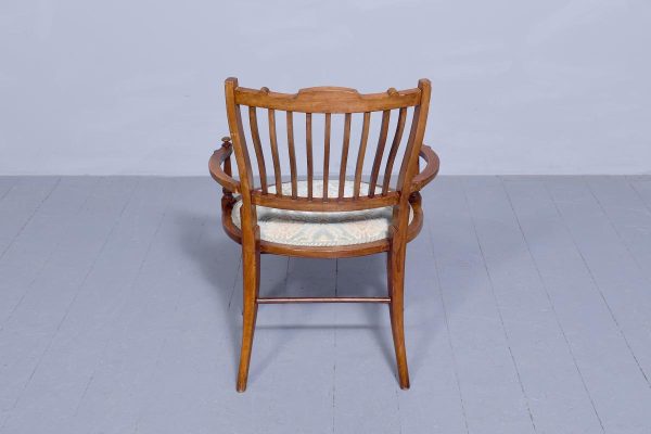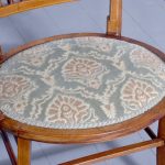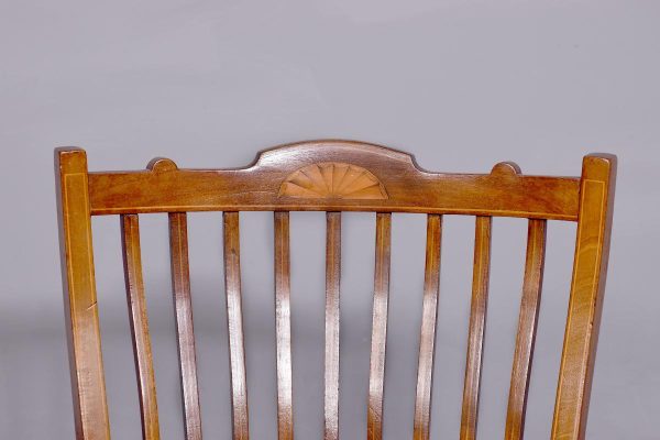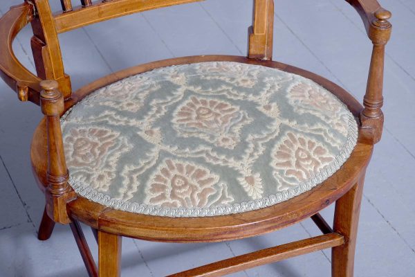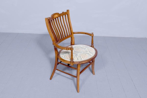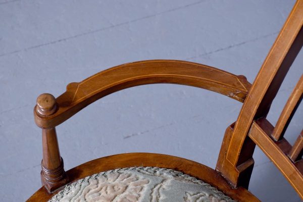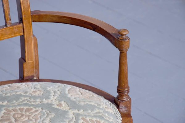 Circa 1890. A neat size mahogany inlaid Sheraton style parlour chair, with shaped cresting rail with a shell inlay and string inlay beneath, the back with inlaid shaped and curved shaped spars, with curved and inlaid arms supported on turned uprights, with an oval upholstered seat, the back legs are turned and slightly out swept, the front legs are square with inlay on the facing, slightly splayed, all braced by various styles of stretchers.