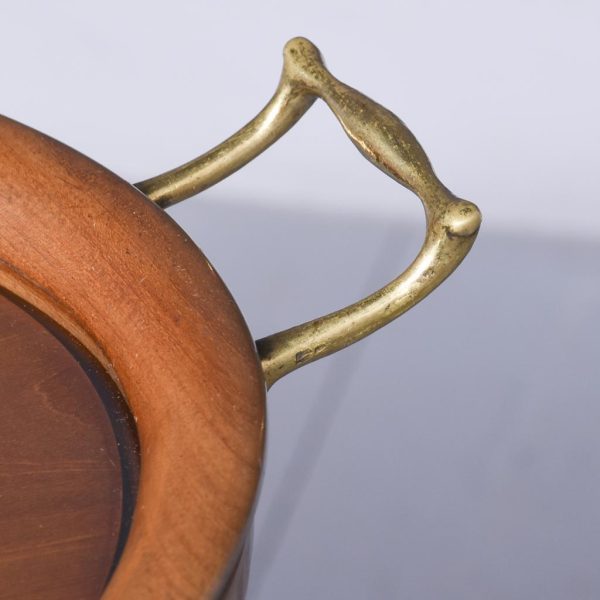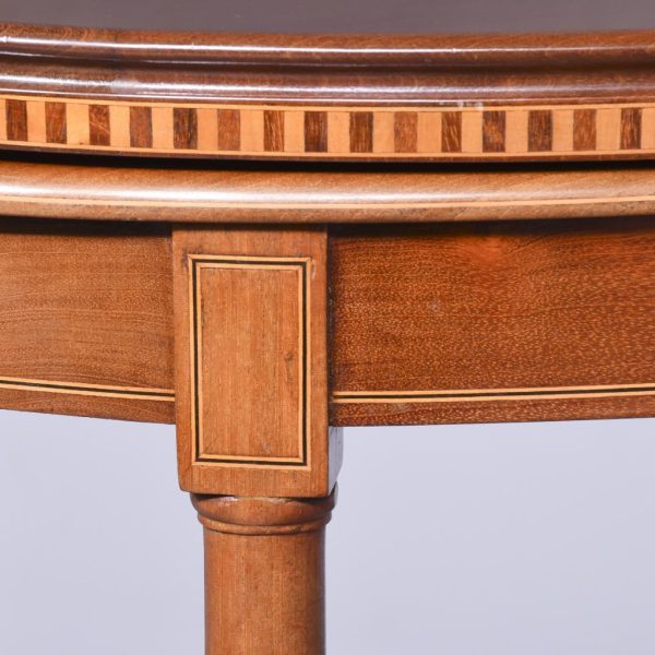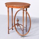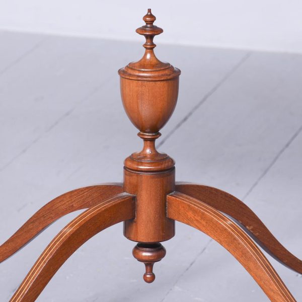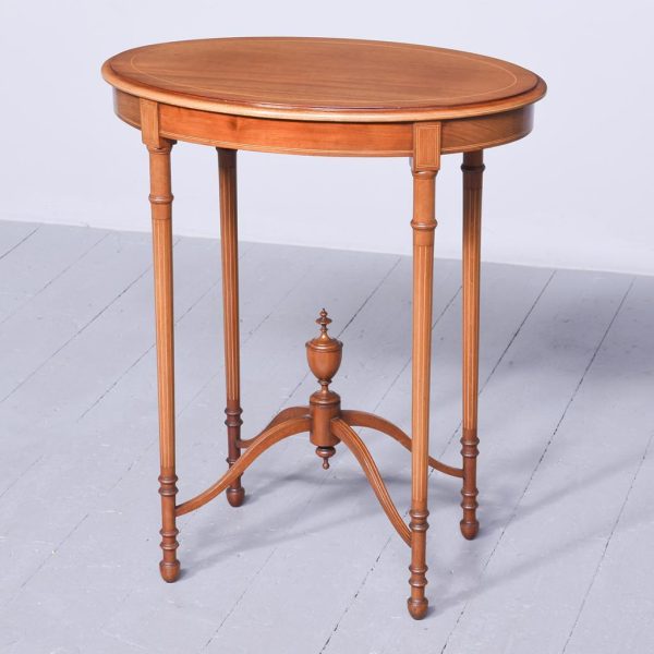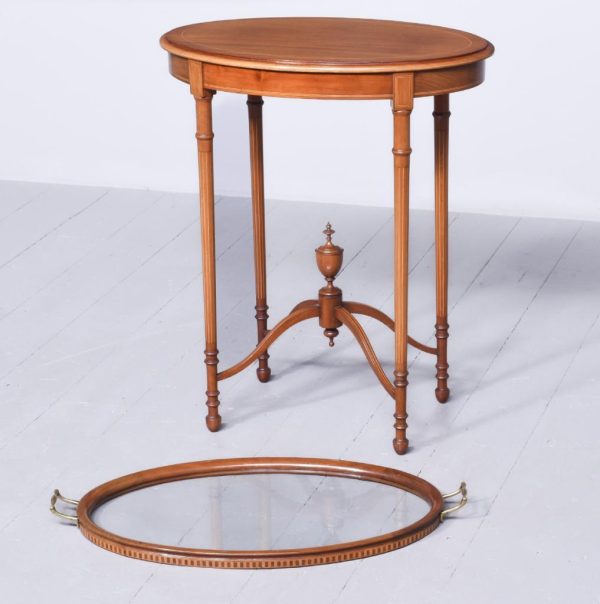 Circa 1900. A mahogany inlaid oval tray top occasional table. The mahogany framed tray with cast brass lifting handles and glass insert, with the oval shaped inlaid table beneath. The sides of the tray have chequered inlay, the inlaid table has a deep frieze and stands on four elegant turned tapering and inlay legs intersected by raised and inlaid stretchers with a large carved urn to the center, and finishing on squat turned bun feet.