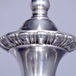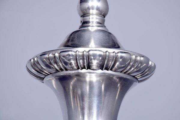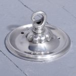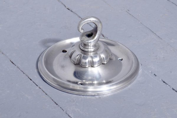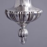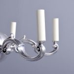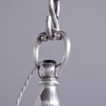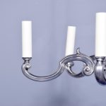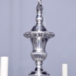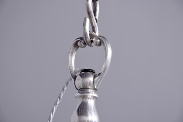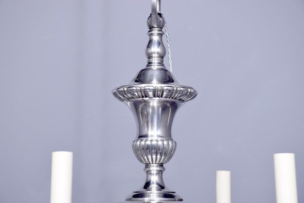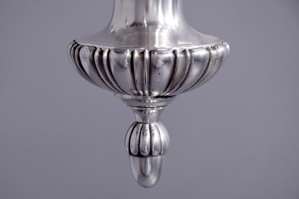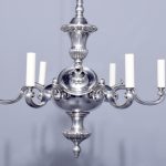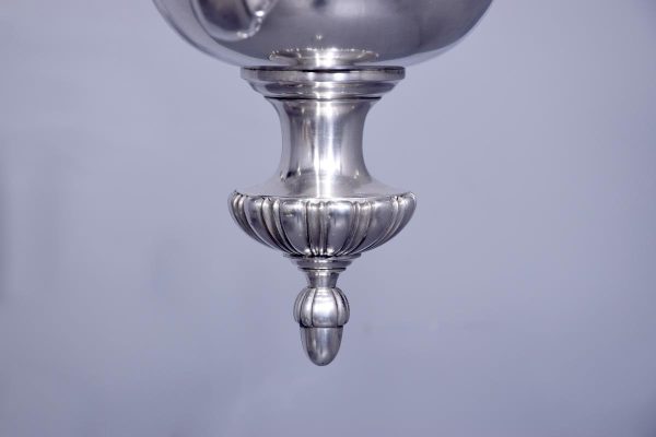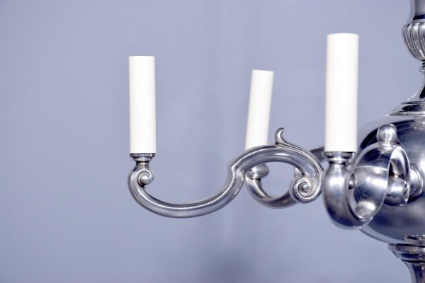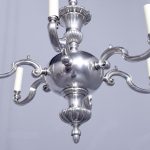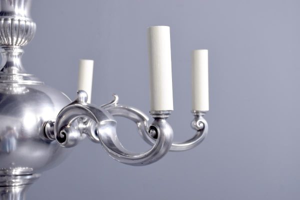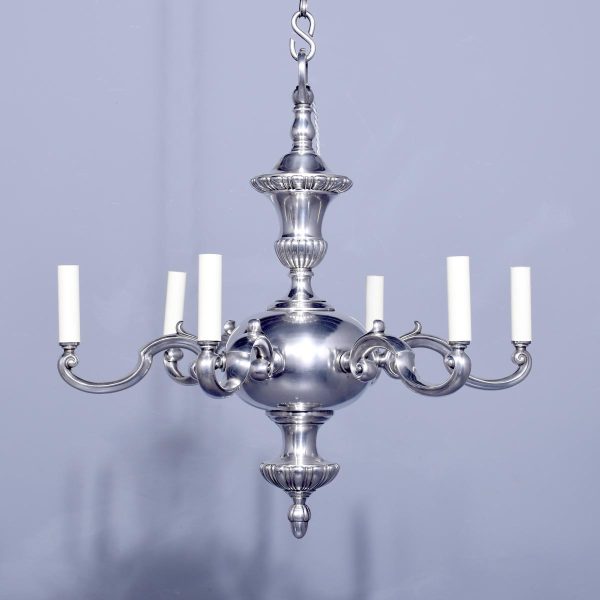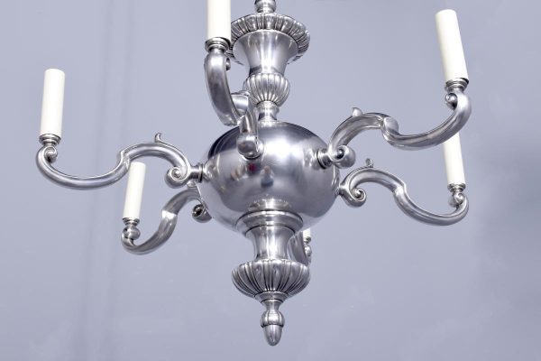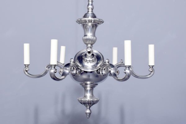 Circa 1930. In excellent condition, an unusual and stylish 6 arm silvered Dutch style ceiling light, the top with a cast and shaped loop with capped fluted urn section beneath, the bulbous body issuing 6 shaped arms now finished with faux candles and lamp holders, the bottom of the light fitting with a fluted section and a downward facing acorn, recently rewired and cleaned.