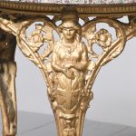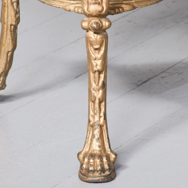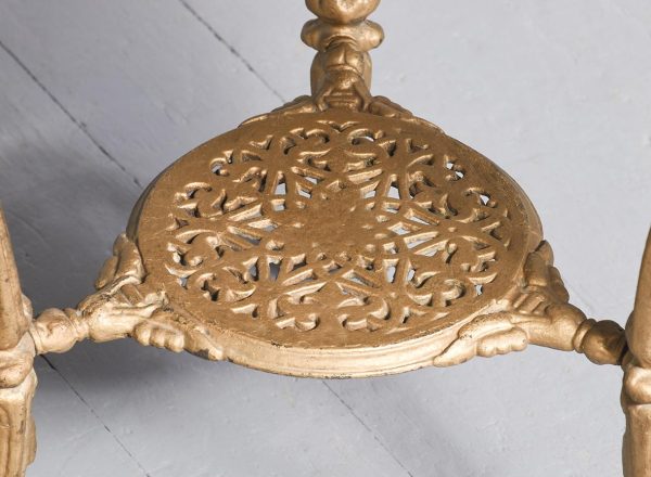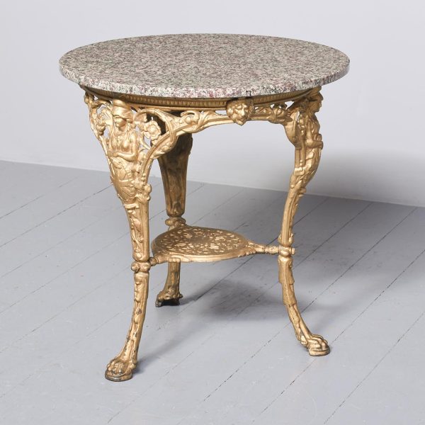 Circa 1880. A quality Victorian cast iron pub table. The top with circular speckled solid granite. The circular base with pierced shaped frieze, with faces on each of the knees of the leg with further pierced sections beneath. The 3 cabriole legs are intersected by a pierced circular shelf in the with foliate casting, and the table finish on elegant cabriole legs with ribbing on the front and a well curled foot.