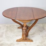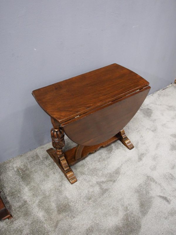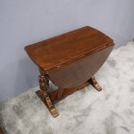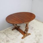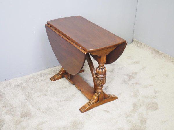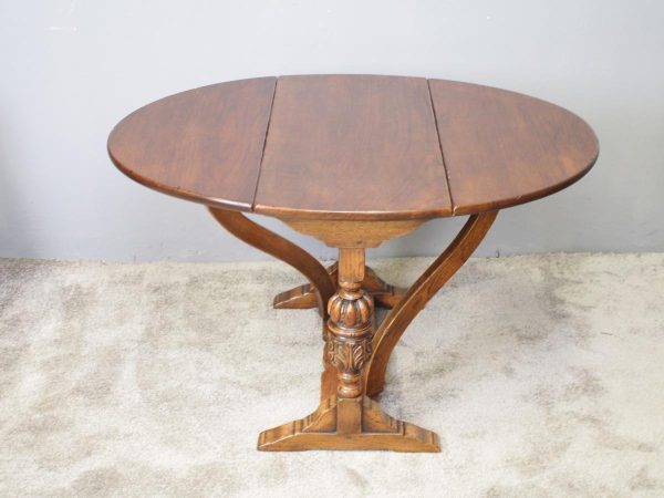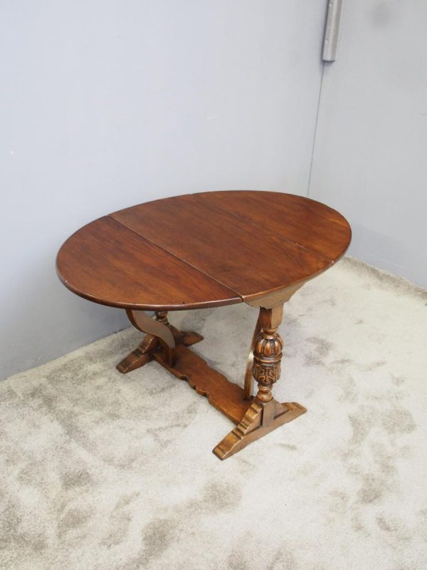 Circa 1920s, solid oak drop leaf, gate-leg table. With solid oak top and 2 D-shaped flaps, standing on 2 carved bulbous uprights and with an unusual swinging action. There is a stretcher between the 2 uprights and it all stands on a shaped trestle base; recently re-polished but with good colour.