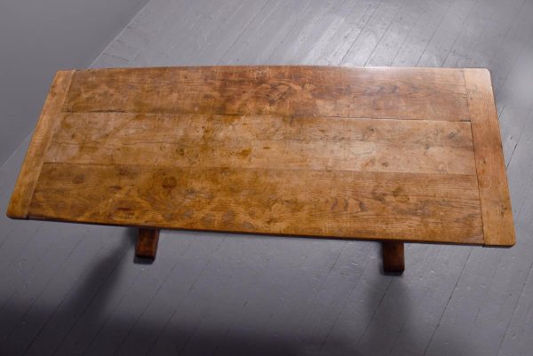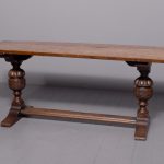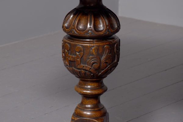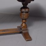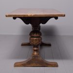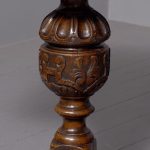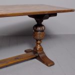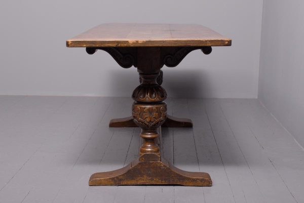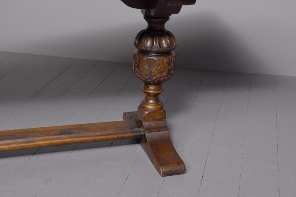 Circa 1860. A mid Victorian carved oak Jacobean style refectory table, the solid top with great colour and patination, resting on a pair of large profusely carved pineapples supported on three scrolling brackets with foliate carving on the sides, on a pair of trestle end feet braced by a large moulded stretcher, can seat 10 diners comfortably.