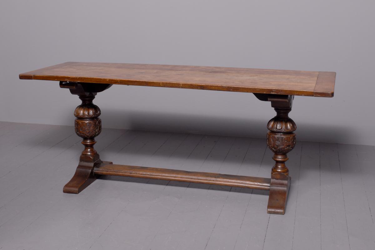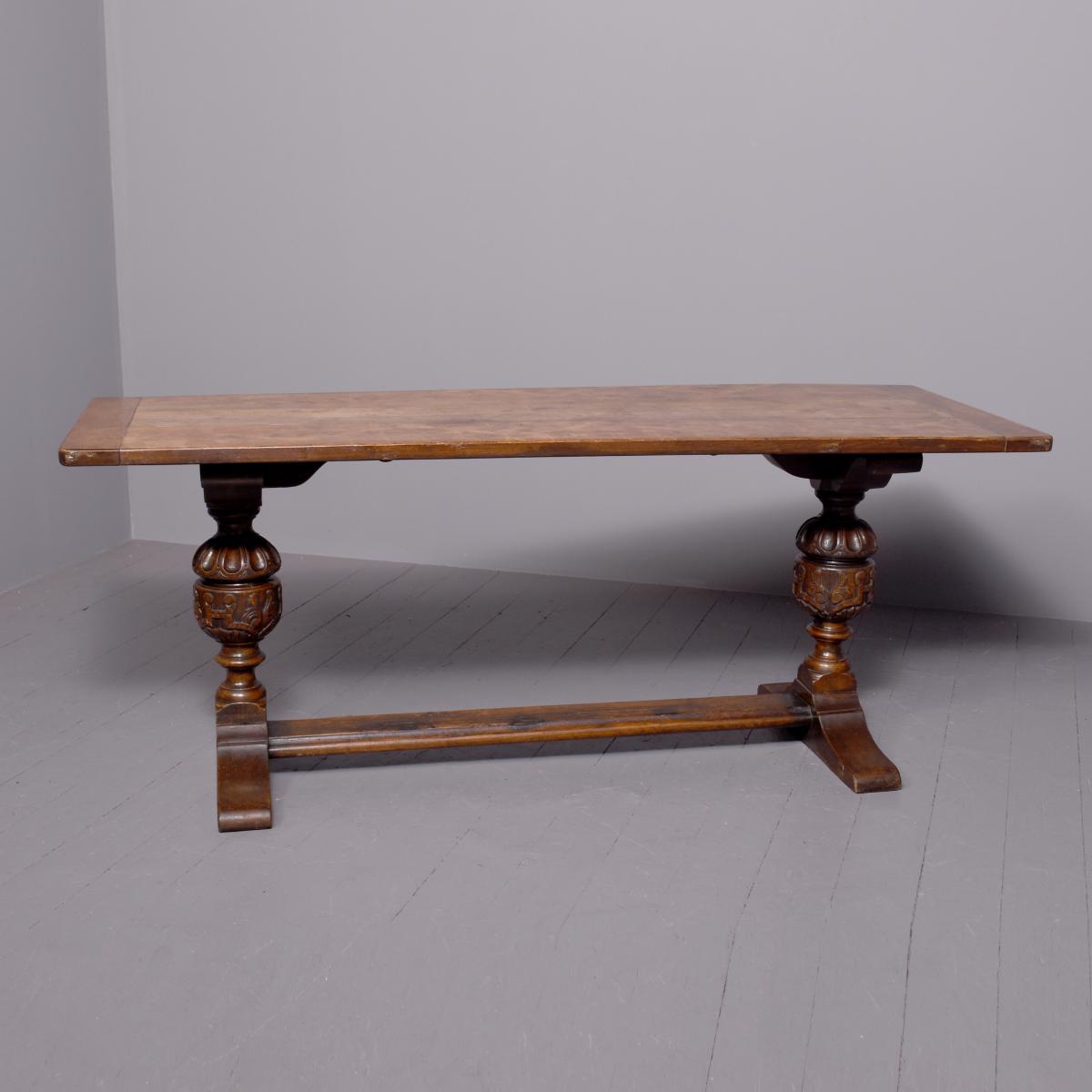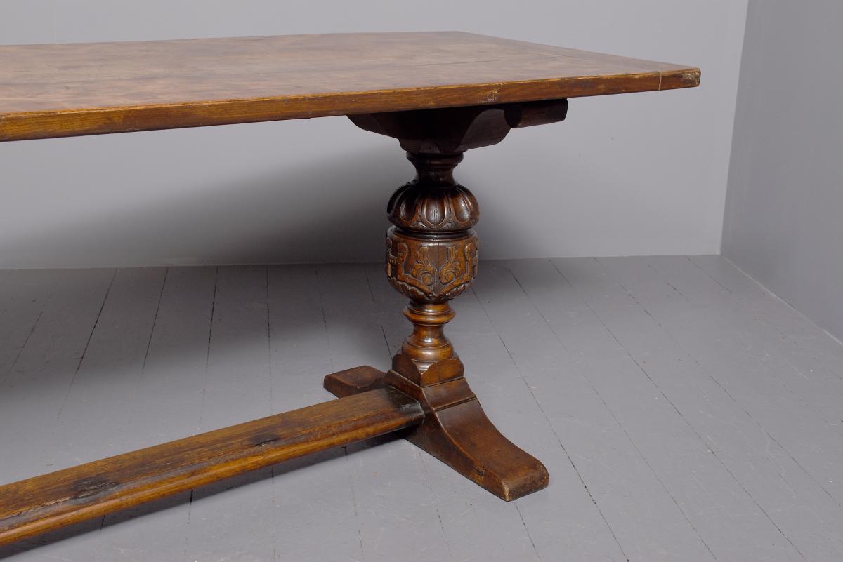 Circa 1860. A mid Victorian carved oak Jacobean style refectory table, the solid top with great colour and patination, resting on a pair of large profusely carved pineapples supported on three scrolling brackets with foliate carving on the sides, on a pair of trestle end feet braced by a large moulded stretcher, can seat 10 diners comfortably.