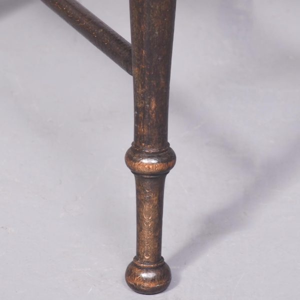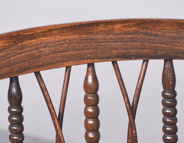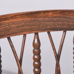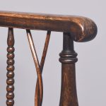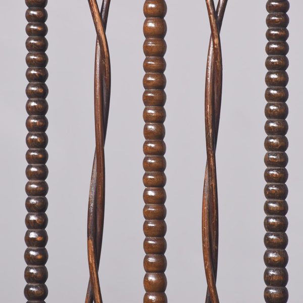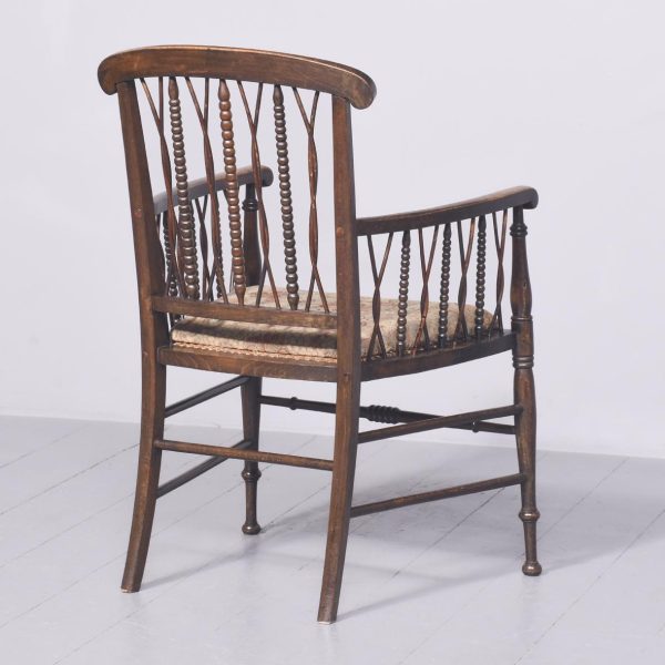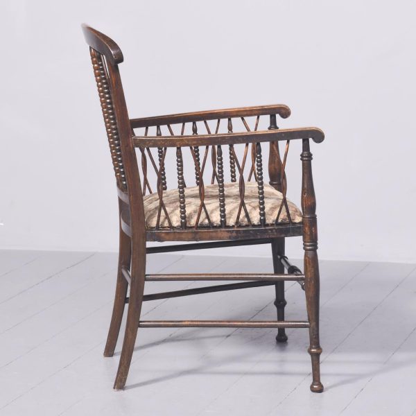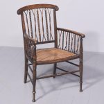 Circa 1900. An unusual and stylish beech bedroom chair. The shaped top rail supported on a mix of bobbin and entwined uprights, the arms held in place with similar supports, with a removable upholstered seat above a Bergere seat, back legs are slightly out swept, front legs are turned ring turned and all legs are braced by turned stretchers.