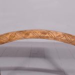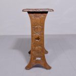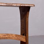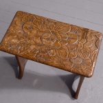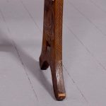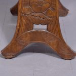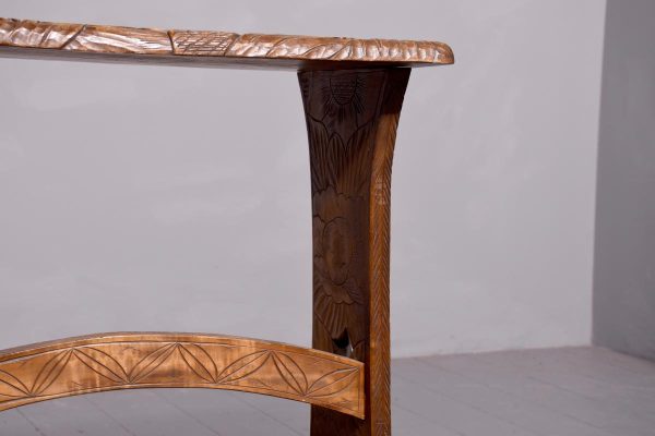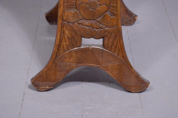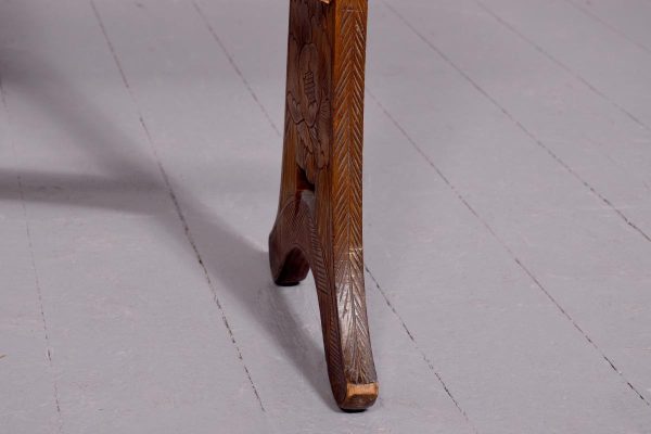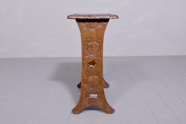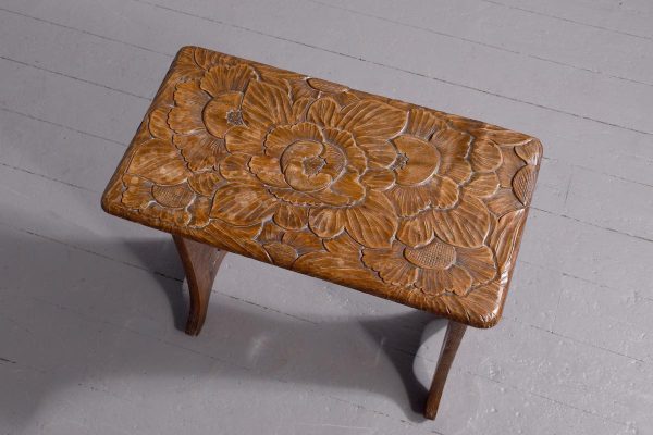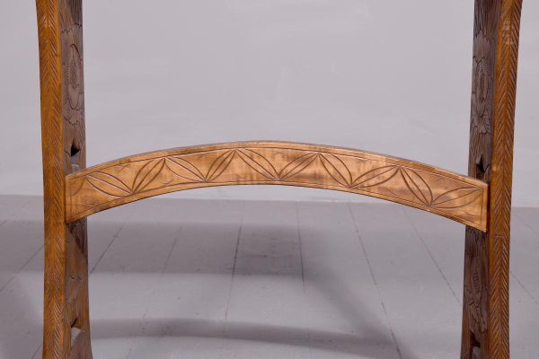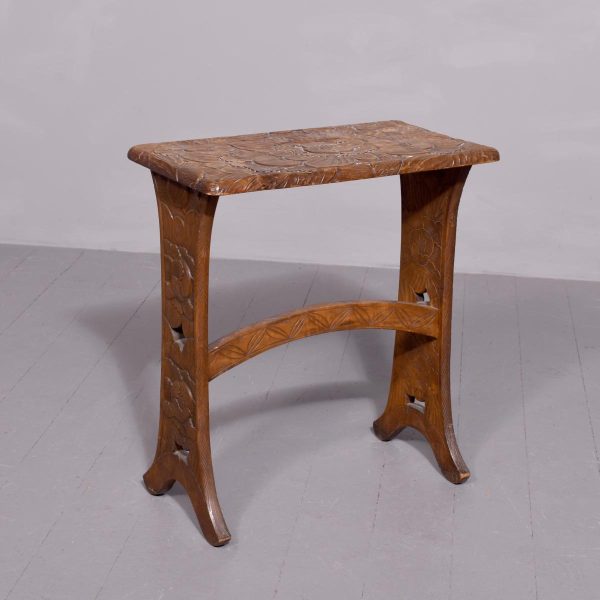 Circa 1900. An unusual stylish carved beech occasional table, probably retailed by ‘Liberty and Co, London.’ The rectangular top with rounded corners with a continual flower decoration carved on the top and the fore-edge, resting on two pierced and carved trestle ends braced by a curved stretcher with a geometric pattern on the top and facings, the fore edge of the trestle ends carved with a herring bone pattern, all resting on two curved feet pierced at the top.