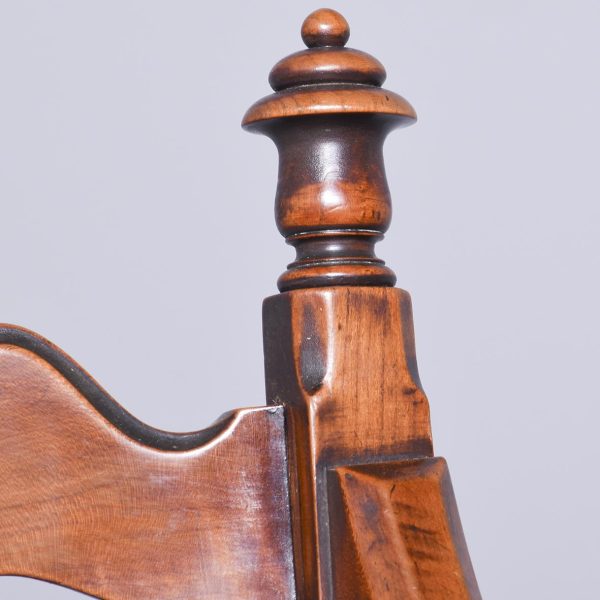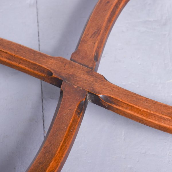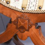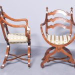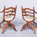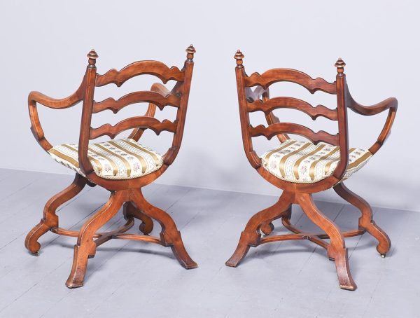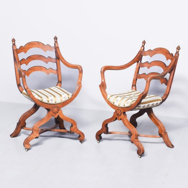 Circa 1900. A neat pair of red walnut X framed easy chairs. The shaped and raised laddered backs, with the uprights finishing with a pair of stylish finials, the curved and shaped arms fixed to the front curved seat rail, with a stuff over upholstered seat with a stylish X framed format beneath. The legs are intersected by a shaped solid stretcher, which braces the legs to give the chair more stability. The underside of each of the chairs is stamped with a number 4650 and the letters ARH.