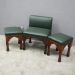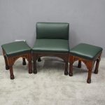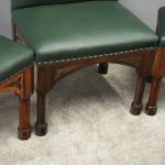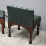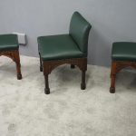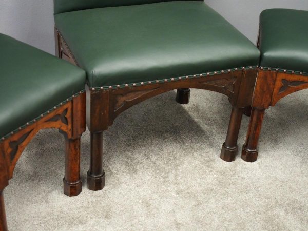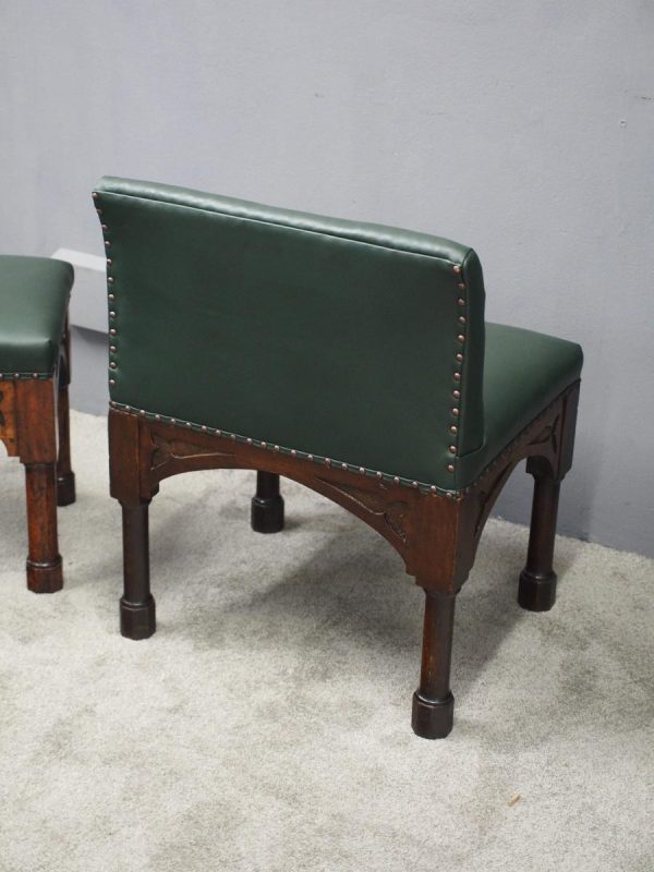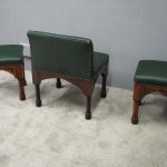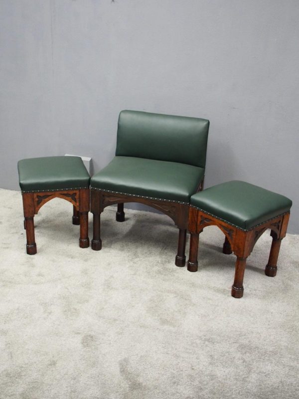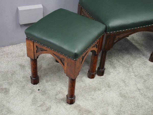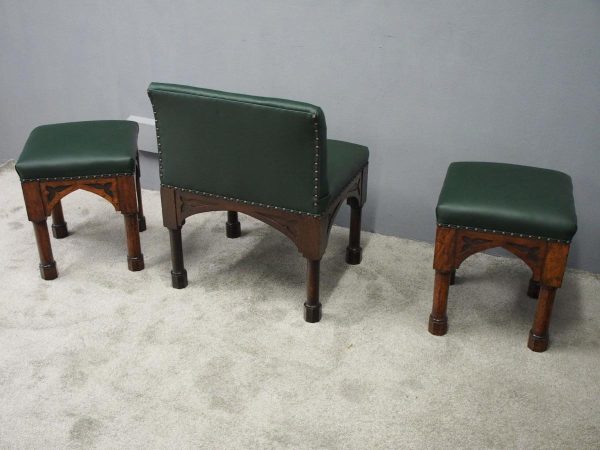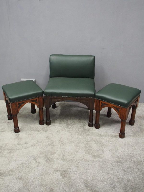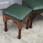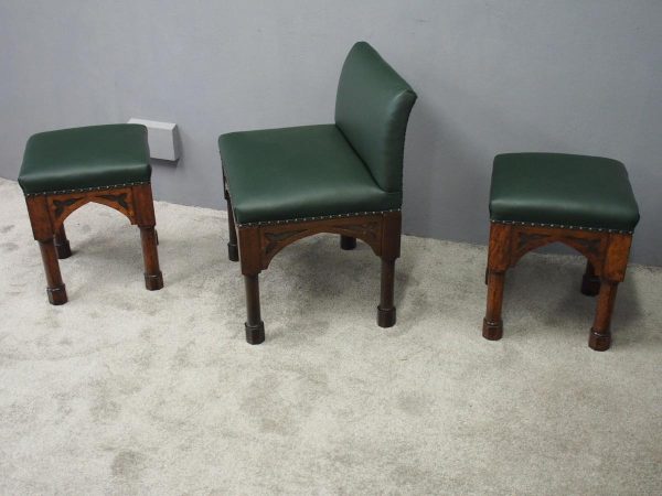 Circa 1890, rare suite of 3 late 19th century Gothic stools, all upholstered in quality green hide with brass studding. The largest with a low back and arched aprons with Gothic trefoil design over turned legs and unusual octagonal feet along with pair of matching square stools. The pair of stools measuring 47 cm high x 38 cm wide x 38 cm deep.