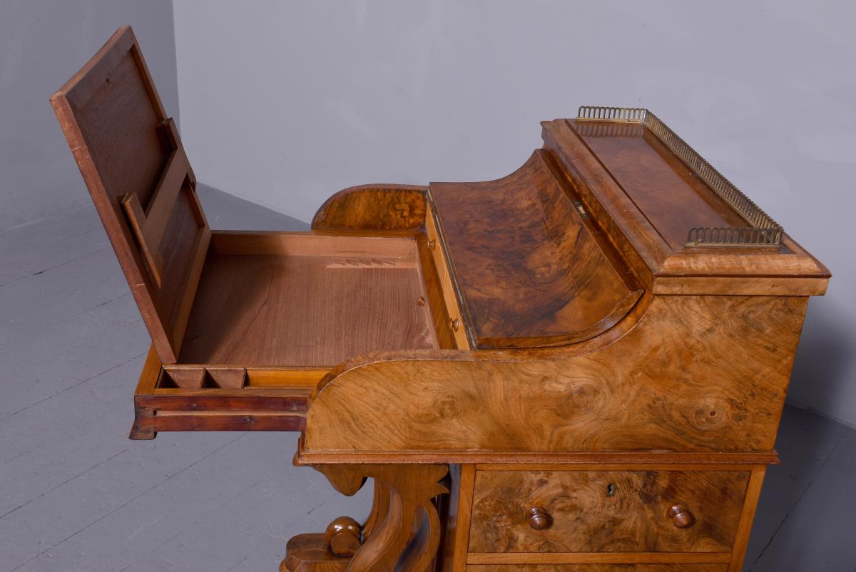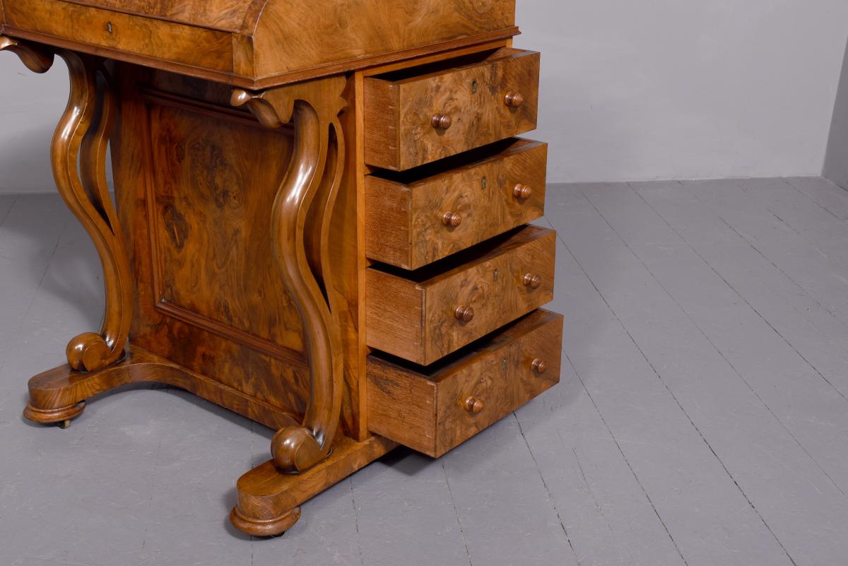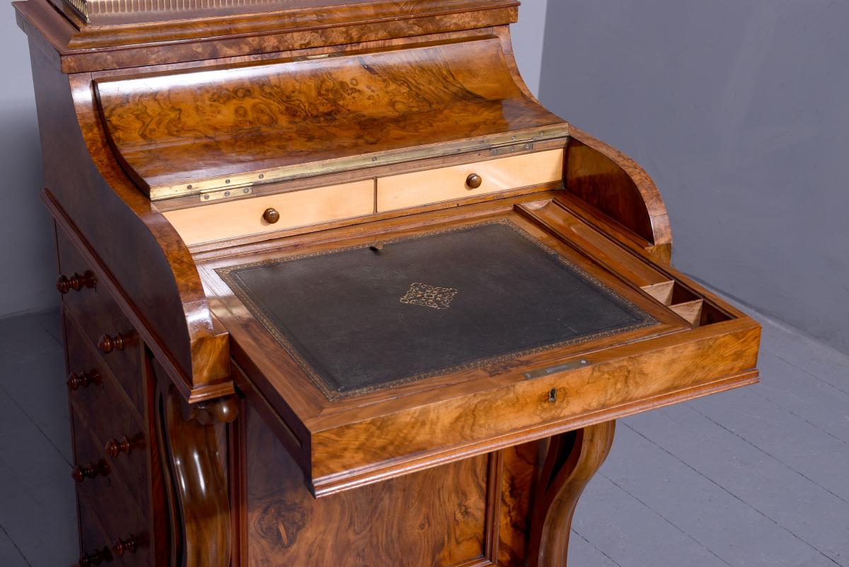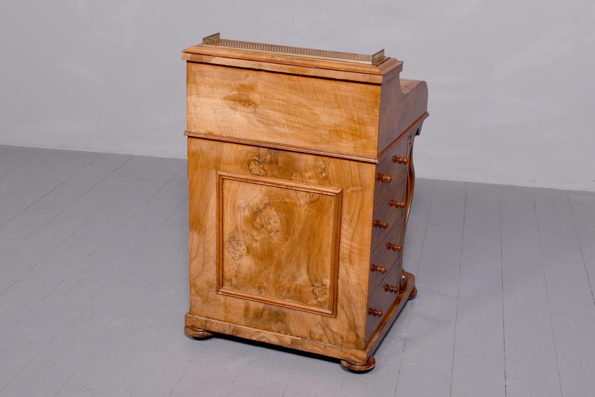 Circa 1850. Superb burr walnut Victorian harlequin (pop-up) piano-top davenport in perfect condition. The pop-up top with a three-quarter brass gallery and mirror matched figured walnut with satinwood fronted drawers and pigeonholes. The shaped piano-top flap opens to a sliding writing surface with pen rests and further drawers, and hidden spring mechanisms. The right side with drawers with figured walnut fronts, finely turned knobs and mahogany drawer linings (a sign of quality), the opposite side with faux drawers. With a polished back & the front with cabriole supports above a platform base with turned feet with hidden brass castors.