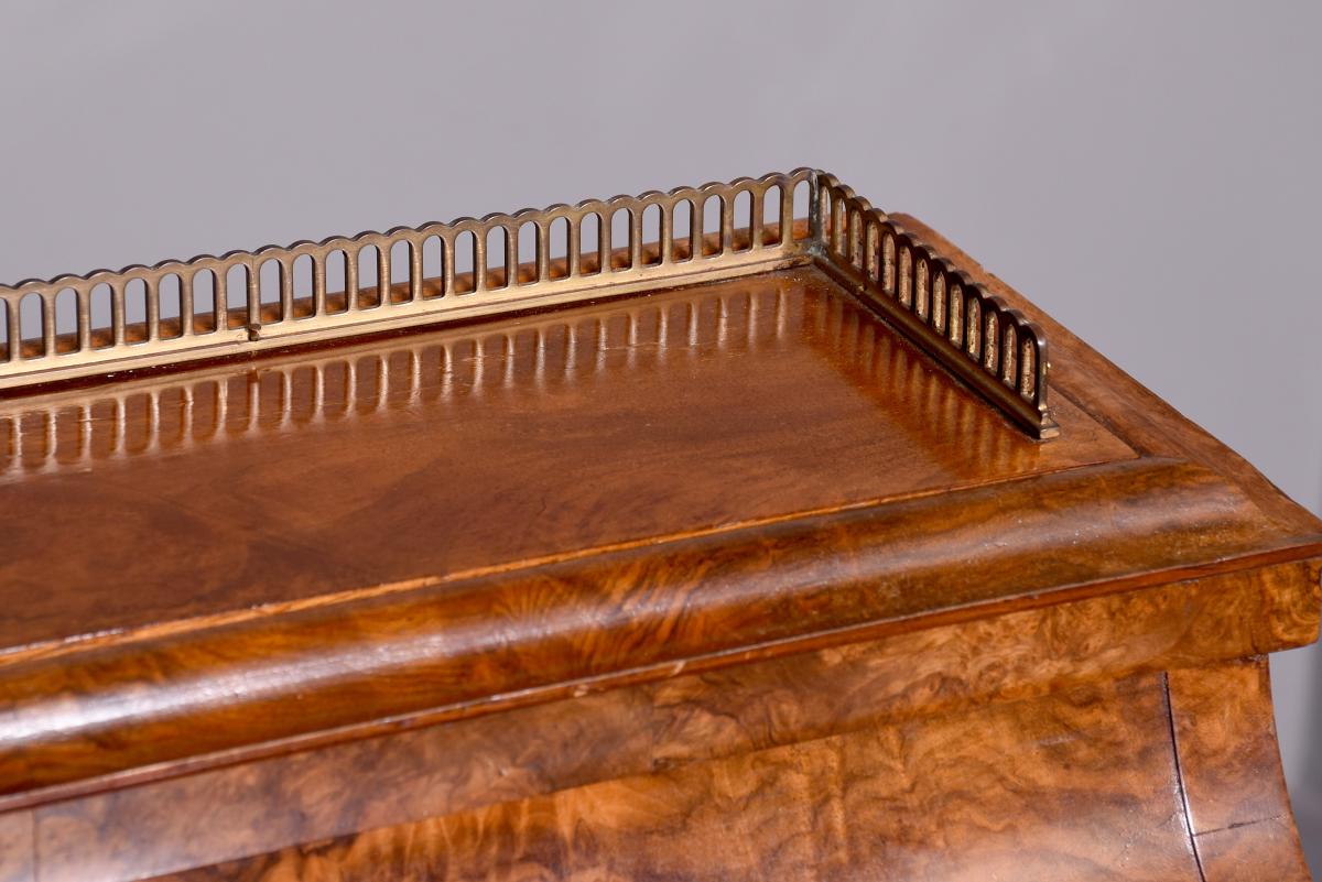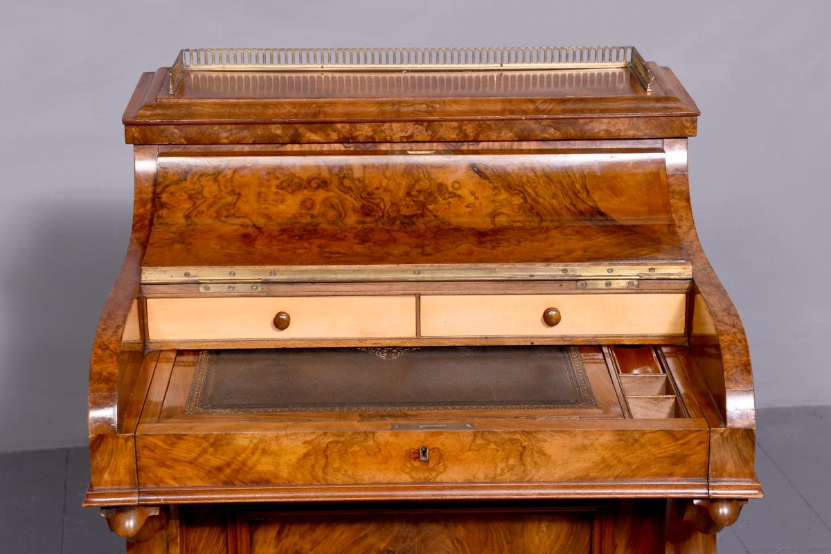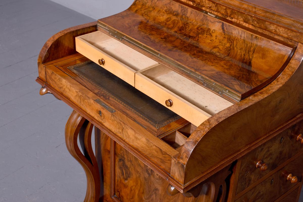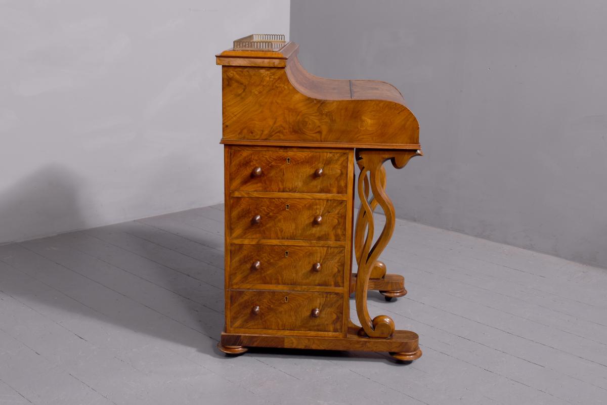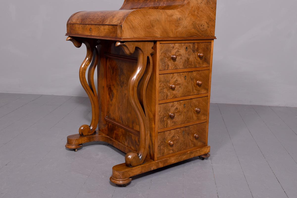 Circa 1850. Superb burr walnut Victorian harlequin (pop-up) piano-top davenport in perfect condition. The pop-up top with a three-quarter brass gallery and mirror matched figured walnut with satinwood fronted drawers and pigeonholes. The shaped piano-top flap opens to a sliding writing surface with pen rests and further drawers, and hidden spring mechanisms. The right side with drawers with figured walnut fronts, finely turned knobs and mahogany drawer linings (a sign of quality), the opposite side with faux drawers. With a polished back & the front with cabriole supports above a platform base with turned feet with hidden brass castors.