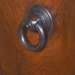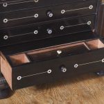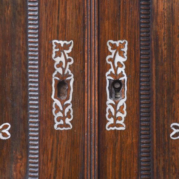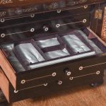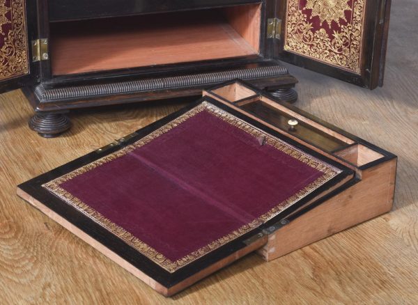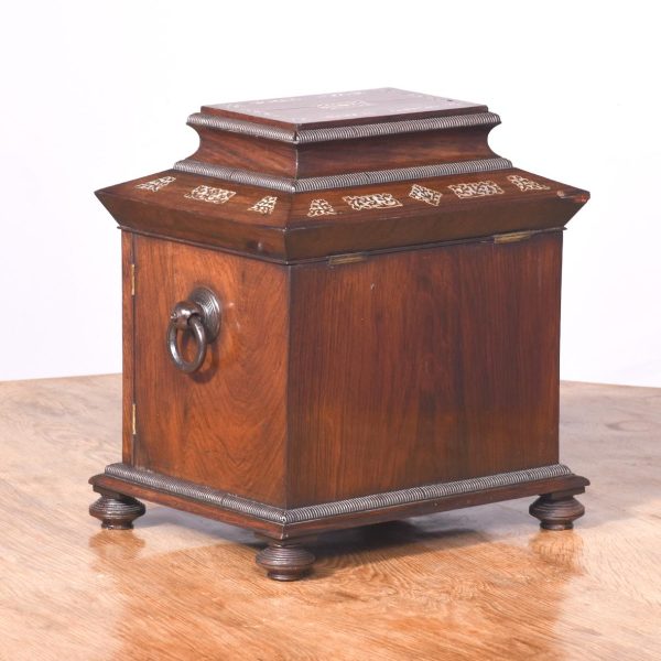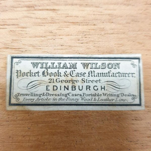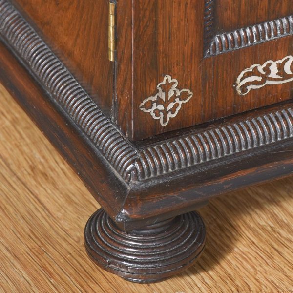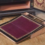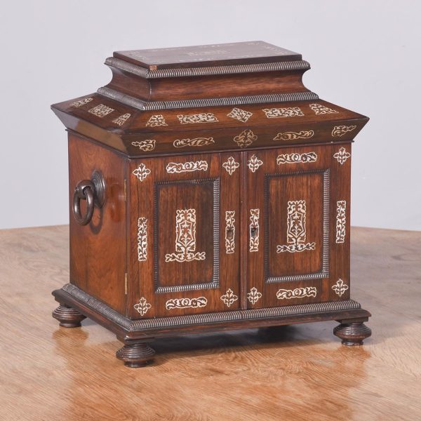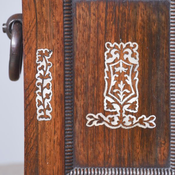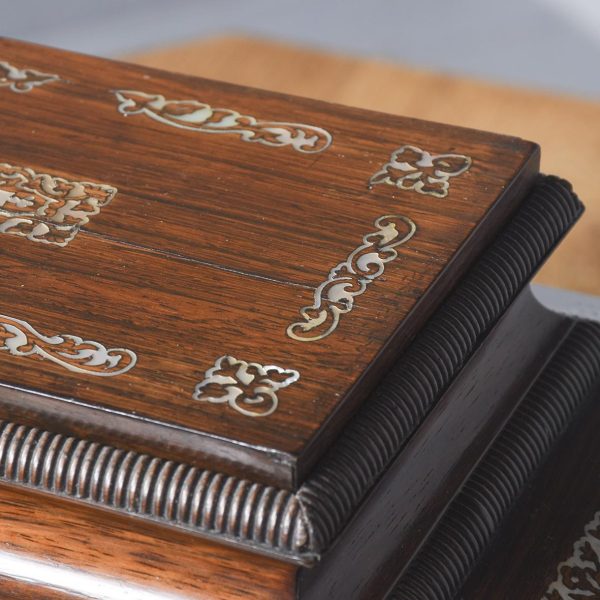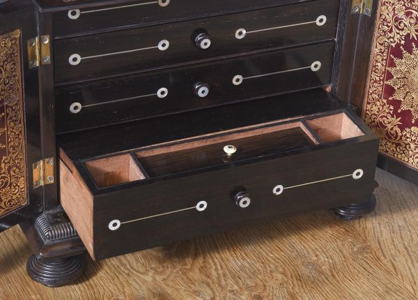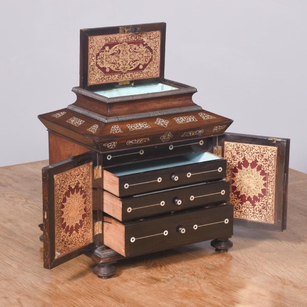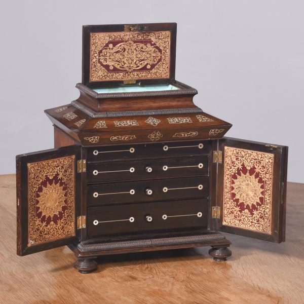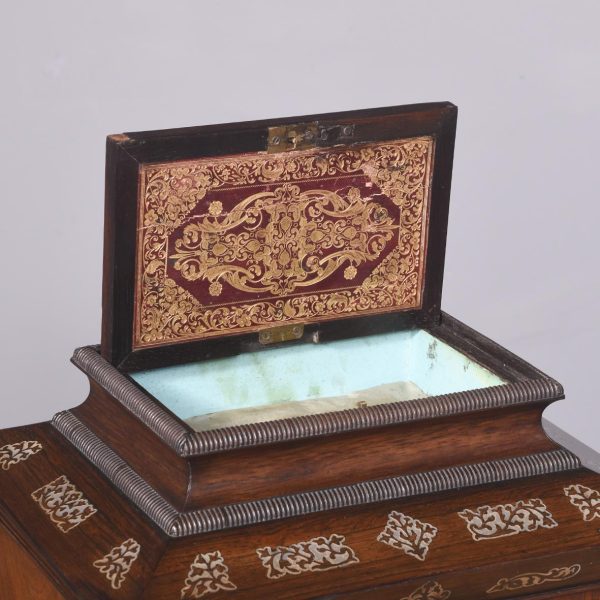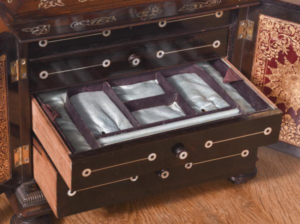Circa 1830. An exhibition quality William IV rosewood and mother of pearl table top jewelry stationary cabinet, with the makers label in 2 locations; ‘William Wilson pocket book and case manufacturer 21 George Street Edinburgh’. The sarcophagus shaped rosewood cabinet, profusely inlaid in mother of pearl inlay, top section is removable inside is fabric lined the top is in finely gilded leather, the top section is hinged and opens to reveal more drawers and a fabric lined interior, the front with a pair of doors with inlay similar to the top with tooled leather inside and small fitted full length drawers fitted out, the bottom drawers pull out to reveal a leather writing surface beneath, cabinet rests on 4 conical ribbed squat bun feet.