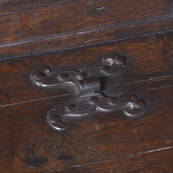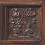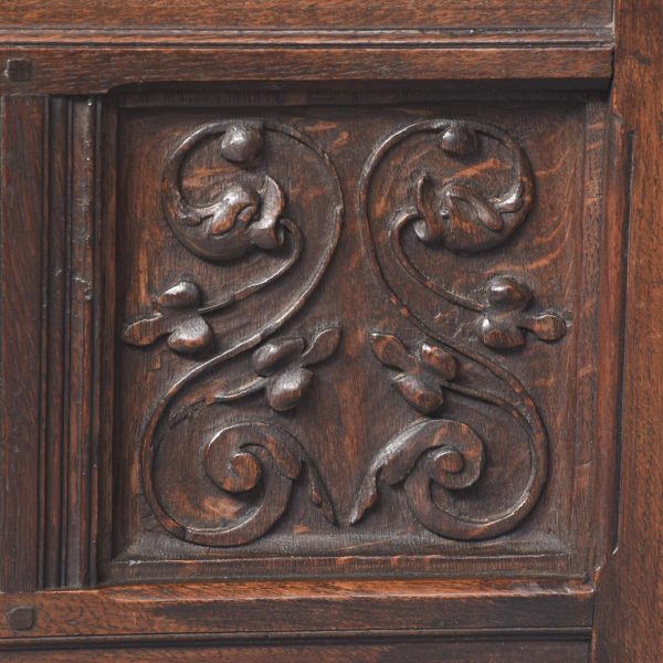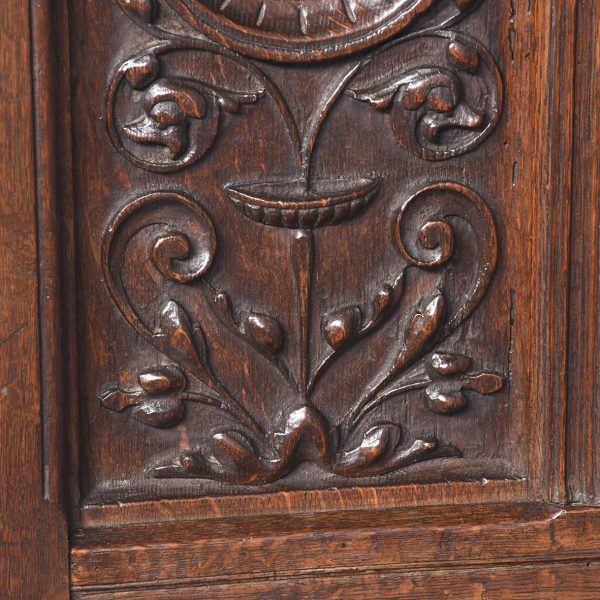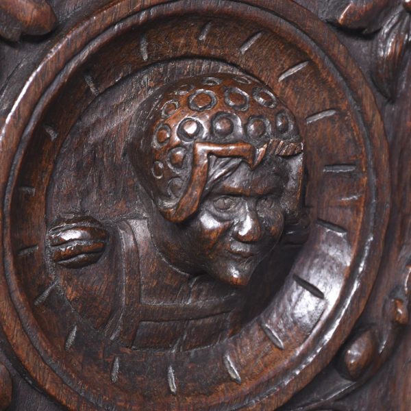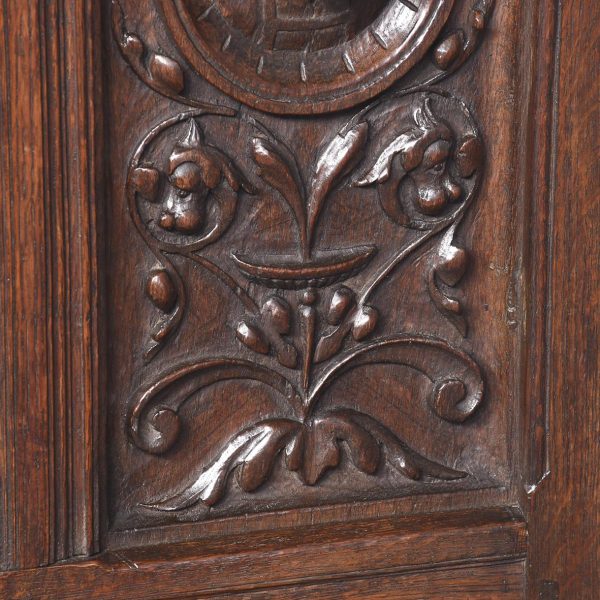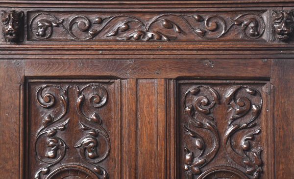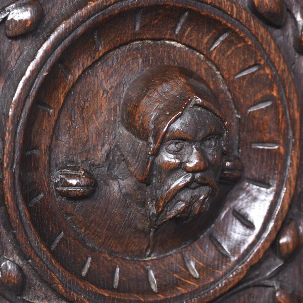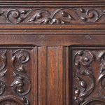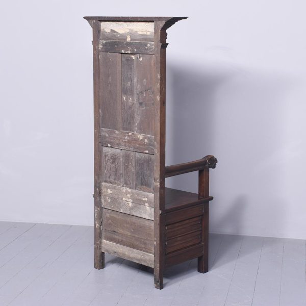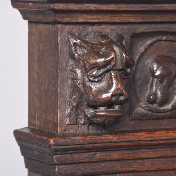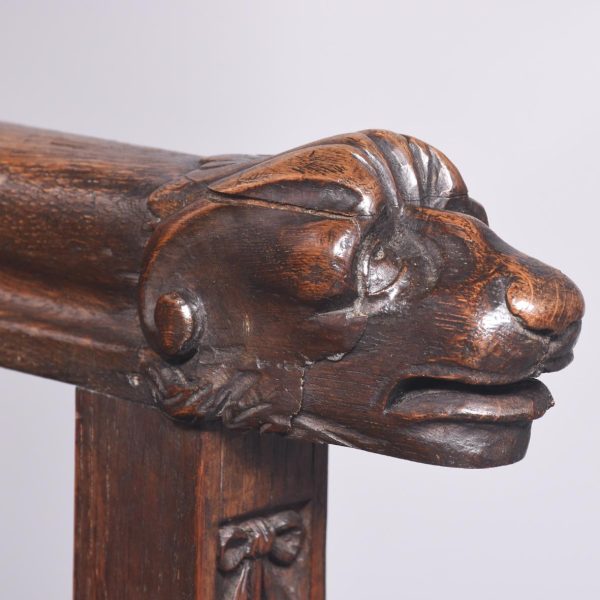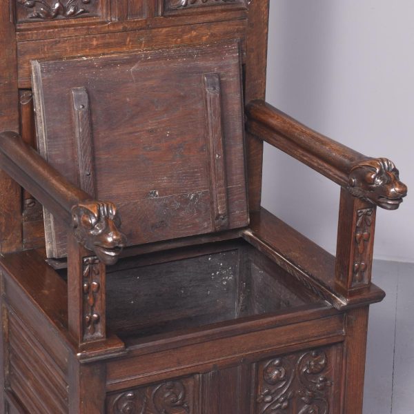 Circa 1870. A French renaissance style carved oak armchair. The tall back with carved romaine style with linen panels above a hinged seat, flanked by open arms with lion head terminals. The box seat with further linen and foliate scrolling panels on styled feet.