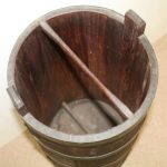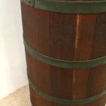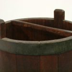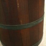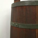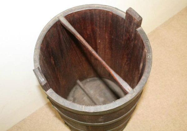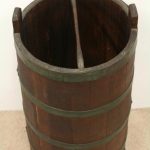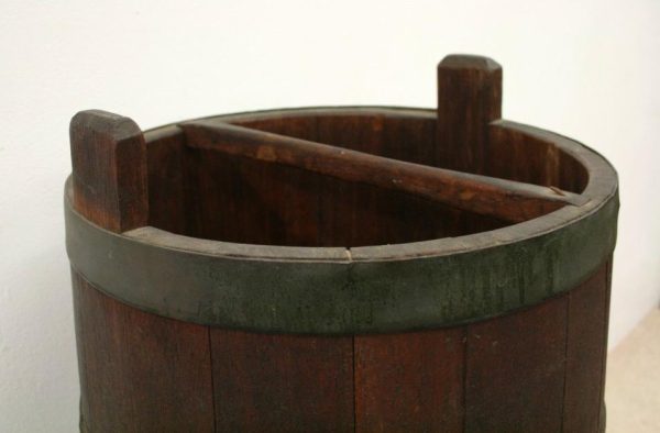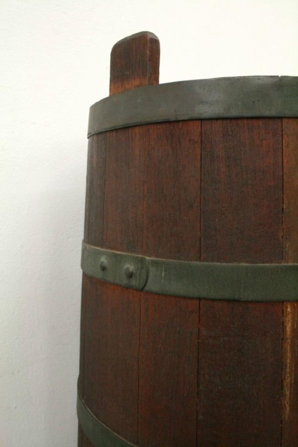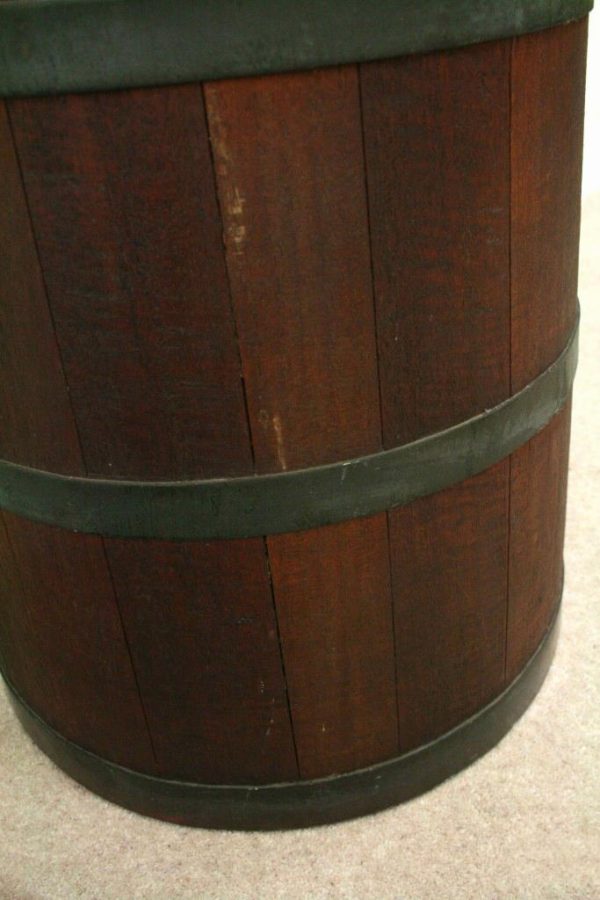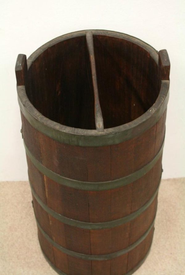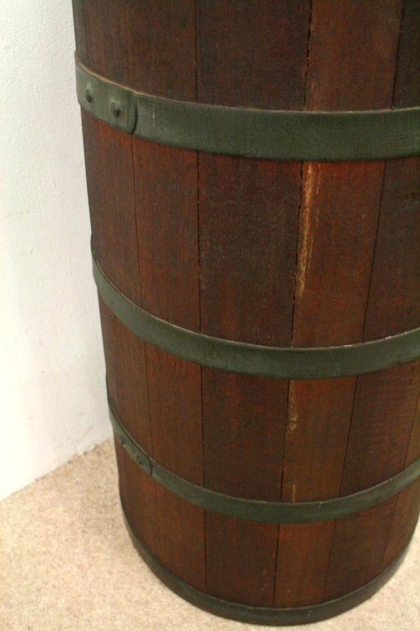 Circa 1900, teak staved butter churn/stick stand of tapering form. The barrel has a broad base which tapers to the top and is held in place by five various bands of copper, which are held in position by two rivets. There are two uprights on the top and a cross stretcher in the centre. The staved barrel retains all the original bandings, colour and patination. Excellent size, very sturdy.
