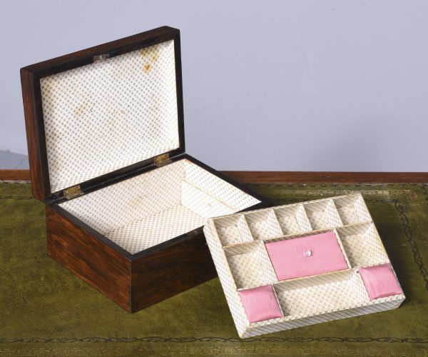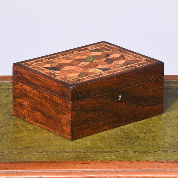 Circa 1890. An interesting neat sized Tumbridge ware and rosewood inlaid sewing box. The rectangular top with multiple inlays and brick pattern, with a lift out fitted interior.