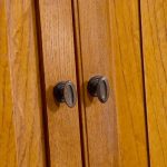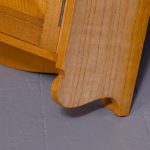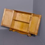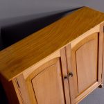 Circa 1920s. A neat sized two door ash wall cabinet, the polished top with a simple fore-edge, the front with two full length doors with arches, raised panels and a pair of stylish brass knobs, inside is a single shelf, beneath the doors there is a shaped gable and back.
