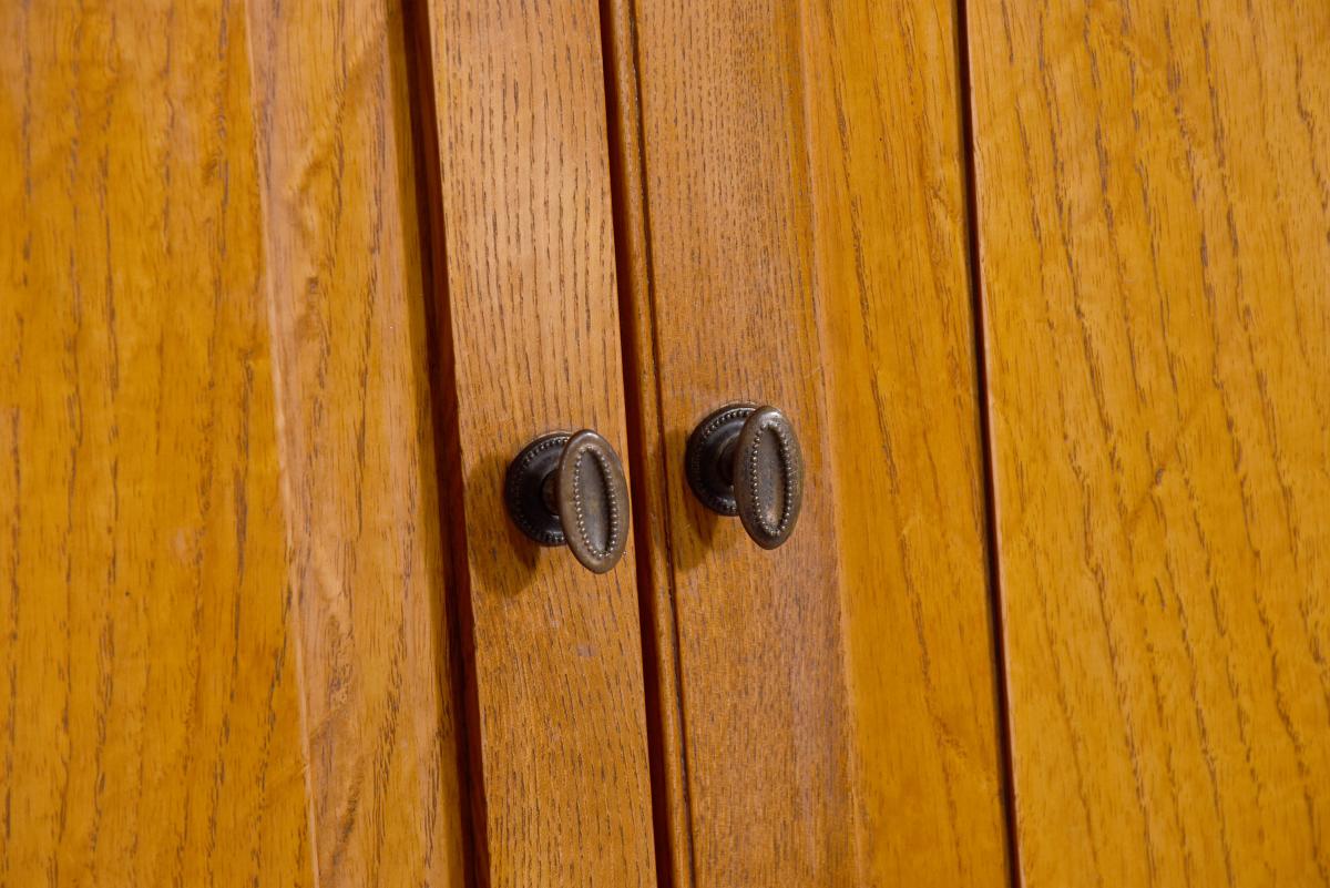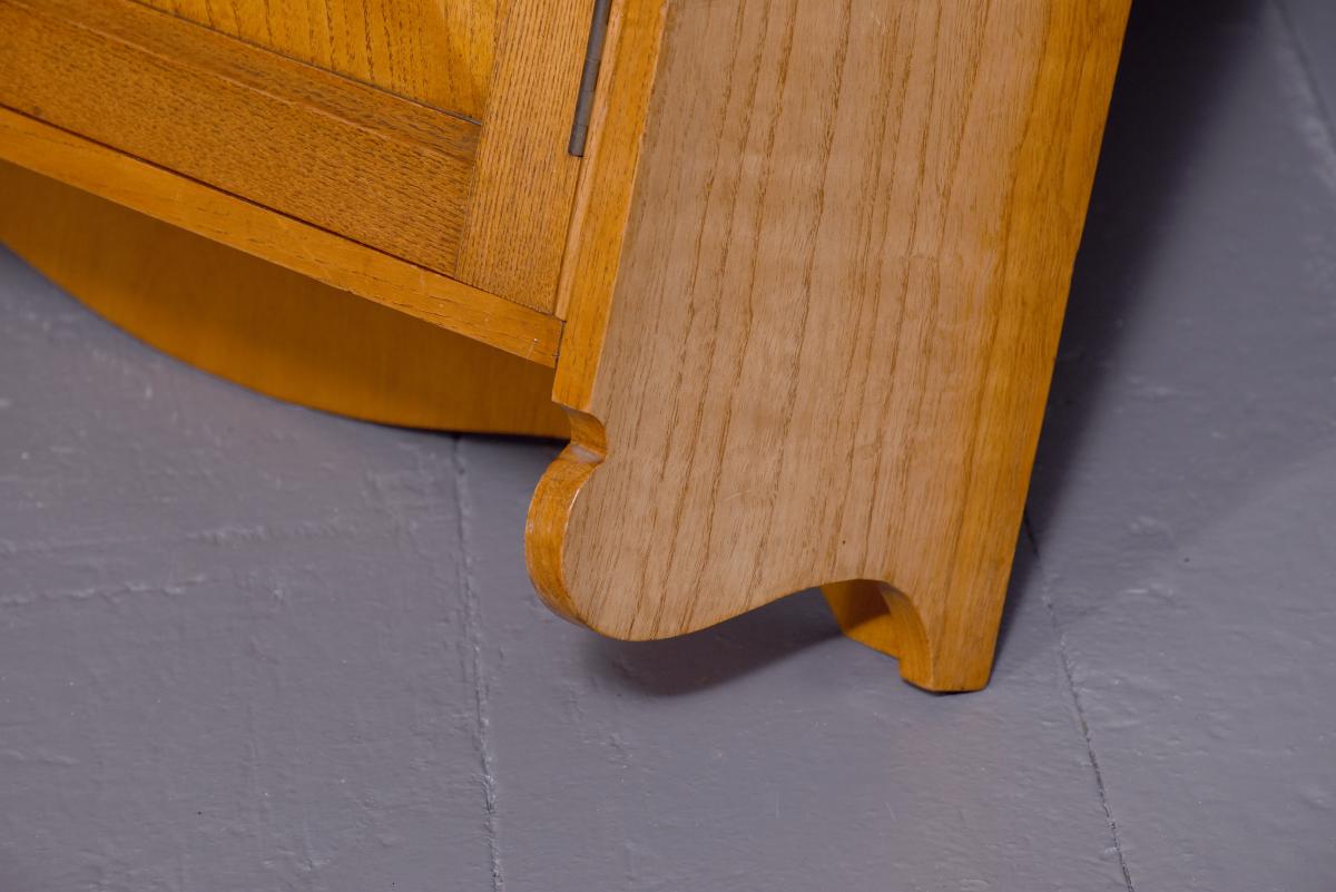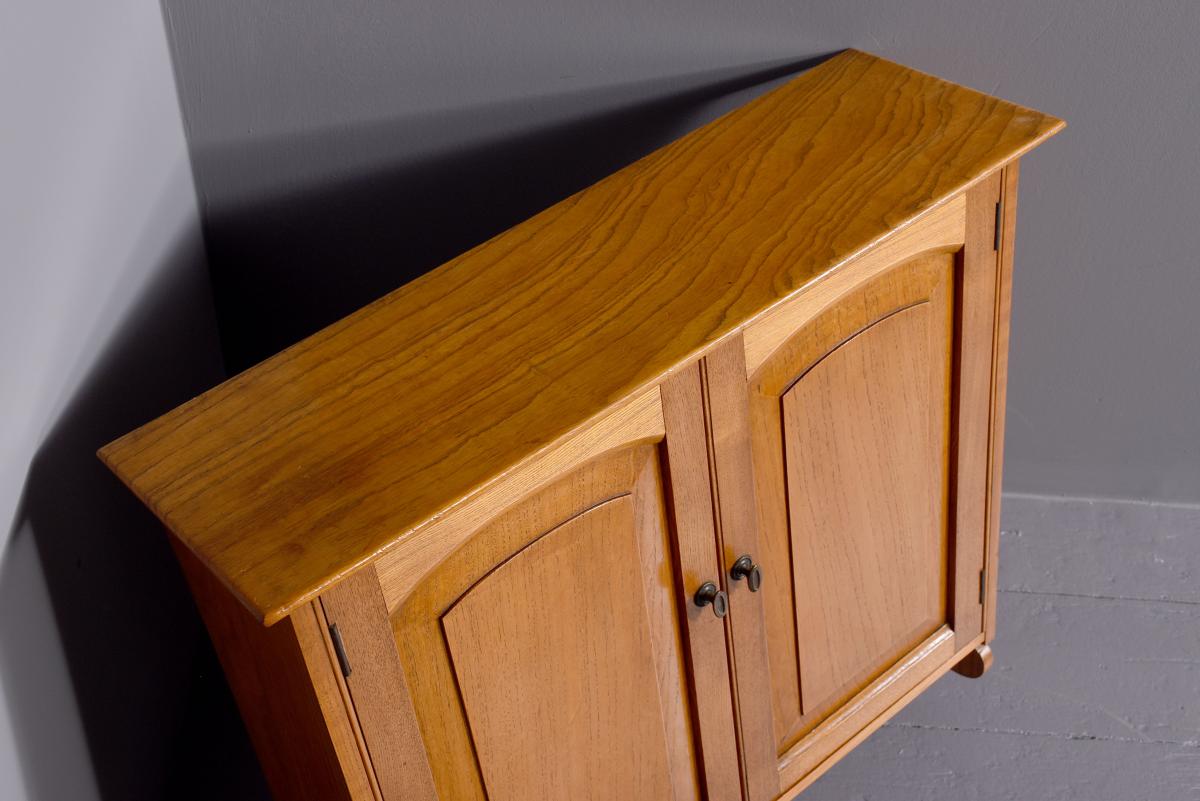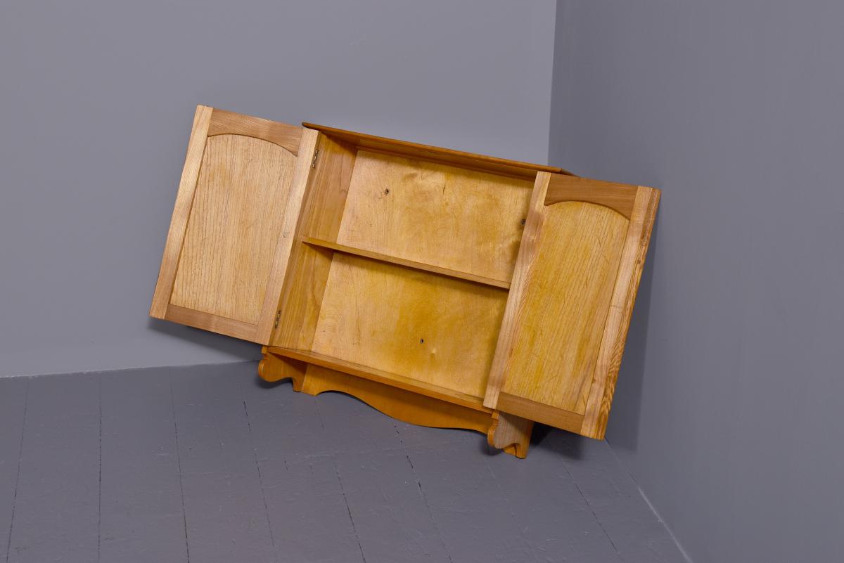 Circa 1920s. A neat sized two door ash wall cabinet, the polished top with a simple fore-edge, the front with two full length doors with arches, raised panels and a pair of stylish brass knobs, inside is a single shelf, beneath the doors there is a shaped gable and back.
