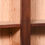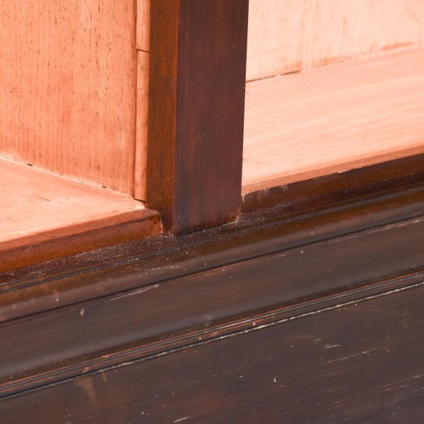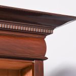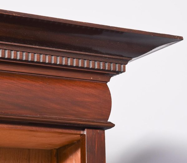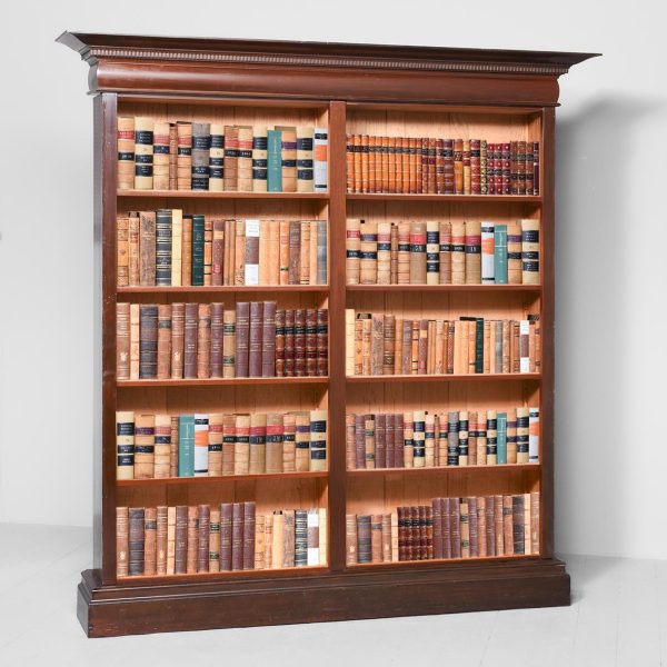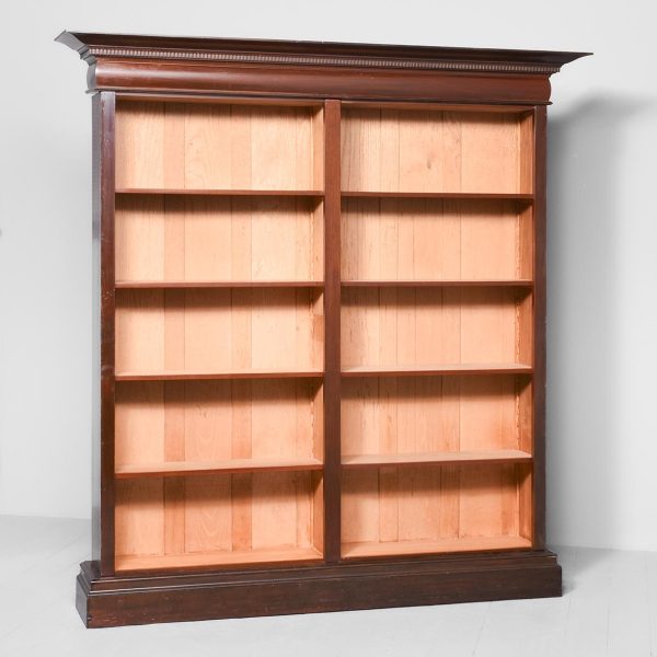 Circa 1880 with adaptations. Two-part tall Late Victorian mahogany open bookcase. Surmounted by a moulded cornice with dentil carvings and a moulded frieze, the two bookcase sections, each with four adjustable mahogany fronted shelves separated by simple pilasters. All sitting on a moulded enclosed plinth base.