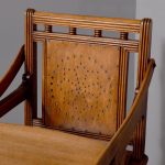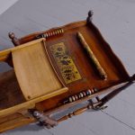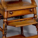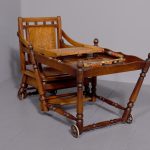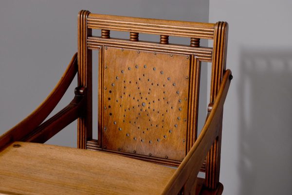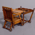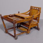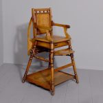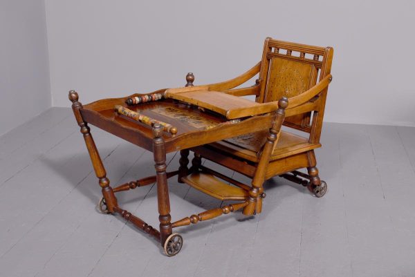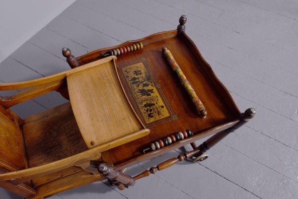 Circa 1890. Unusual articulated child’s high chair/play table. The chair with fluted top rail with spindles and a pierced back; with an elevating tray above fluted arms and a pierced seat and foot rest. The whole table folds over to a games table with abacus to the sides and rotating coloured beads. Rare item, fully traditionally restored.