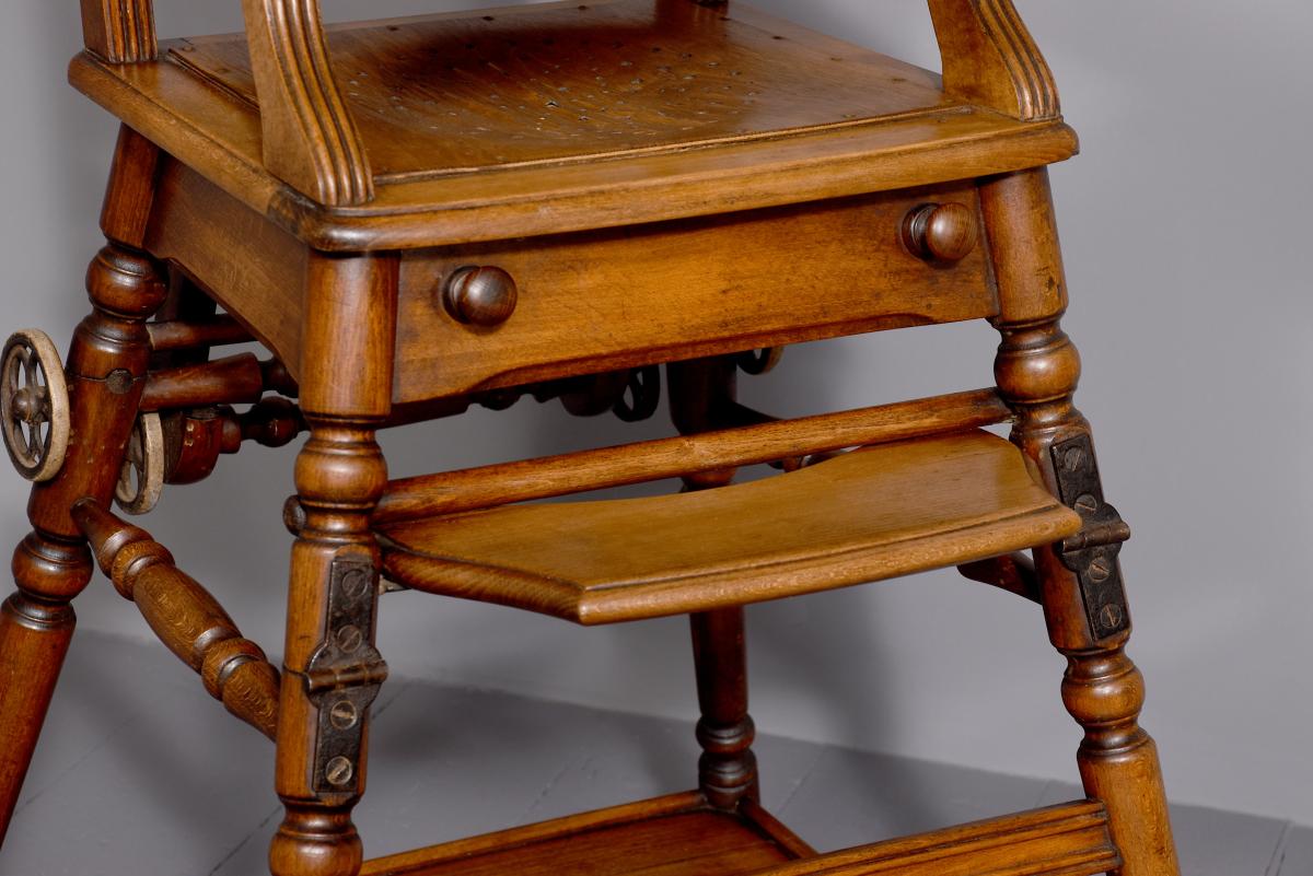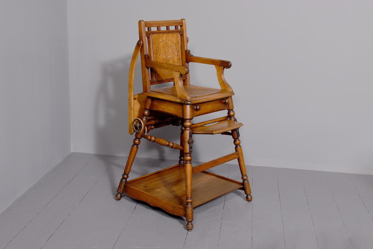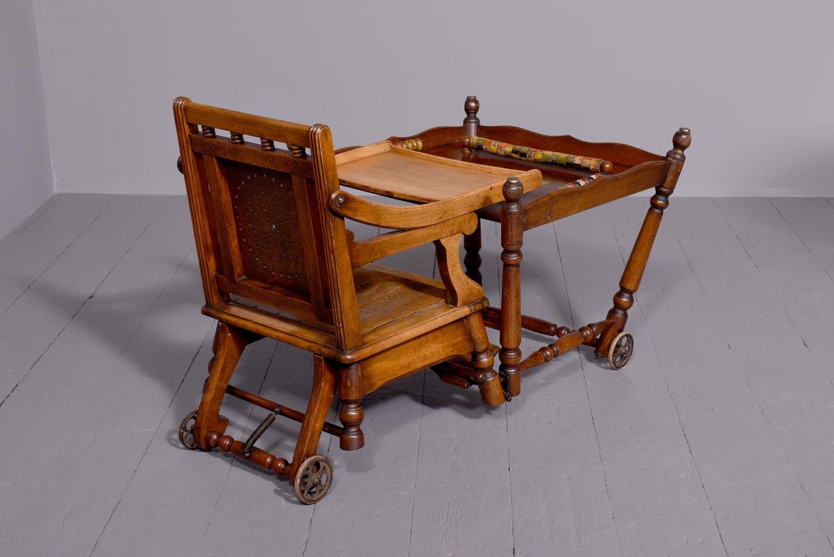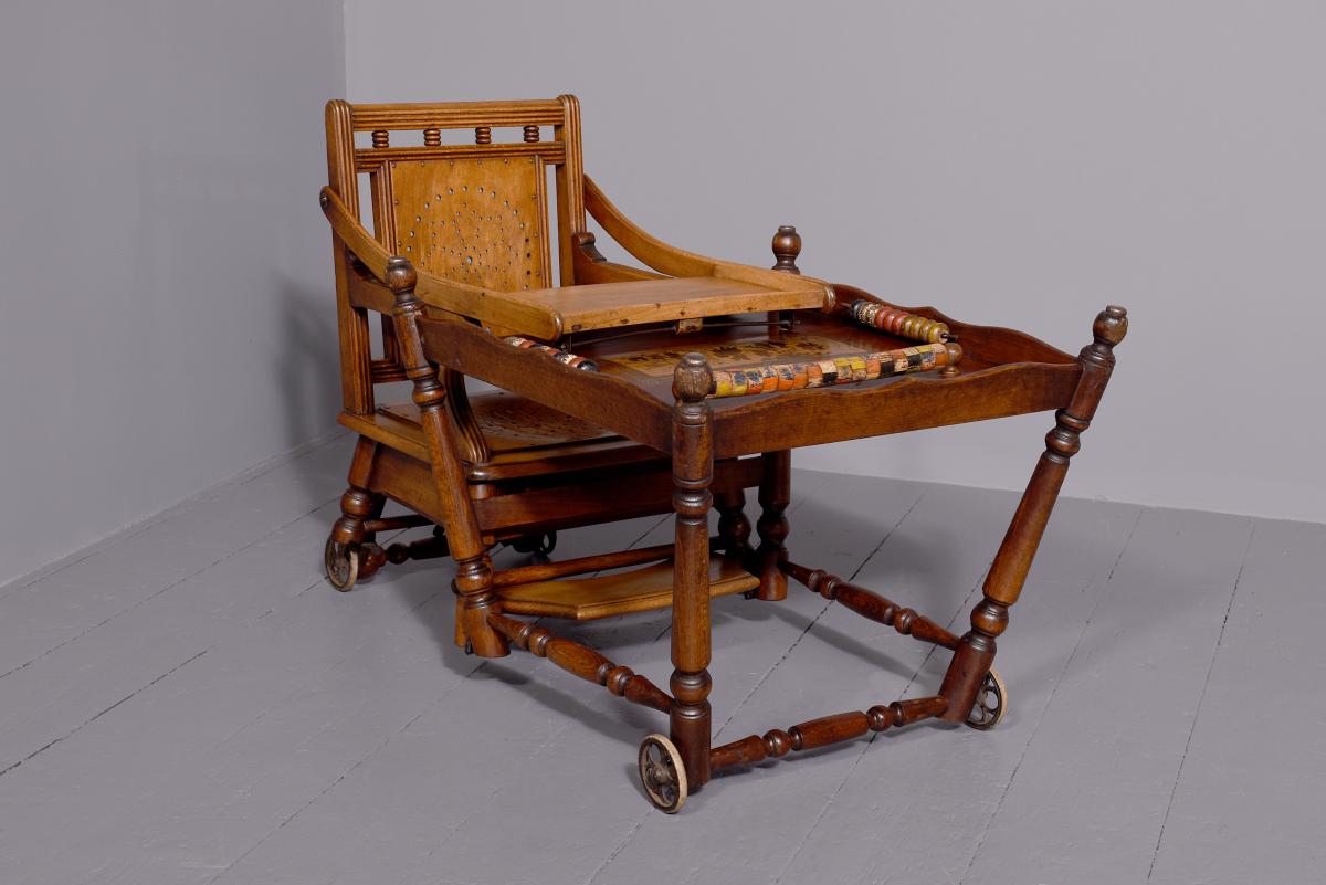 Circa 1890. Unusual articulated child’s high chair/play table. The chair with fluted top rail with spindles and a pierced back; with an elevating tray above fluted arms and a pierced seat and foot rest. The whole table folds over to a games table with abacus to the sides and rotating coloured beads. Rare item, fully traditionally restored.