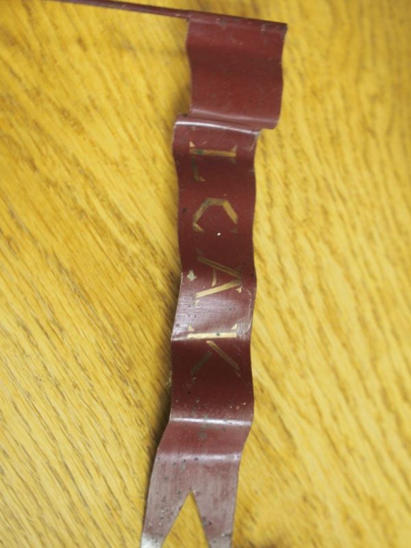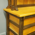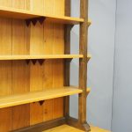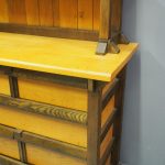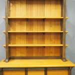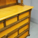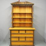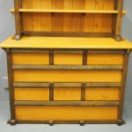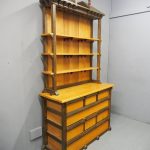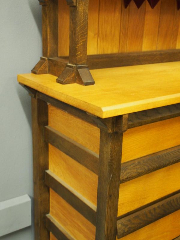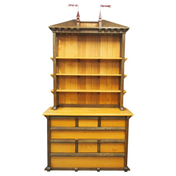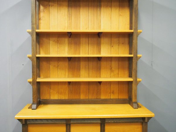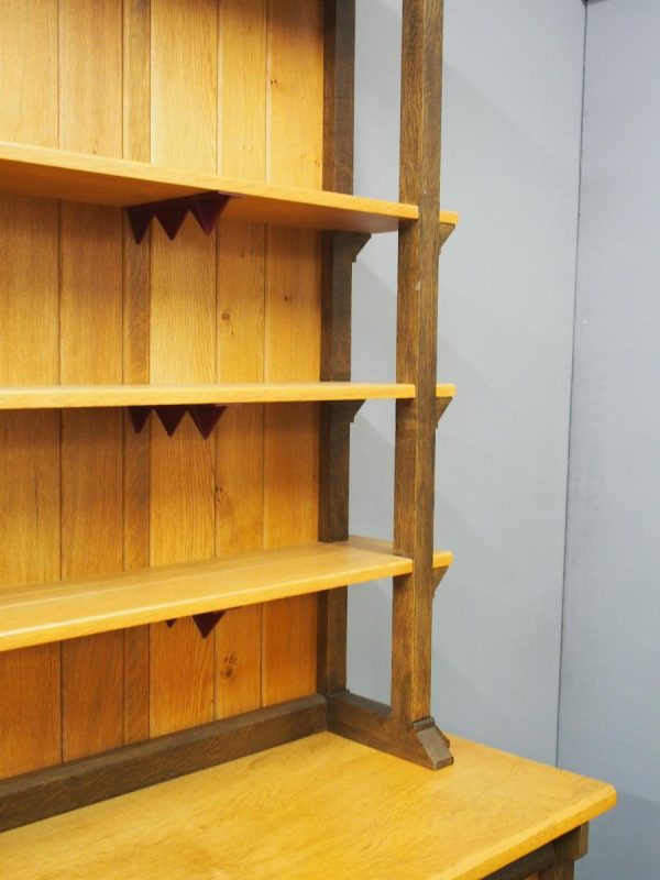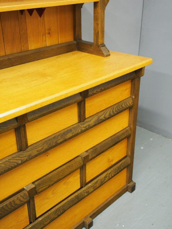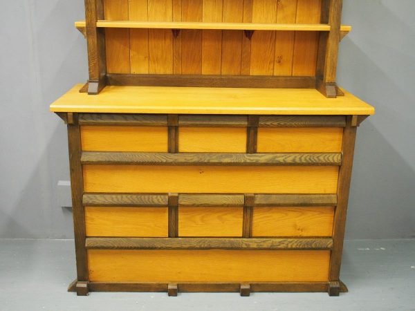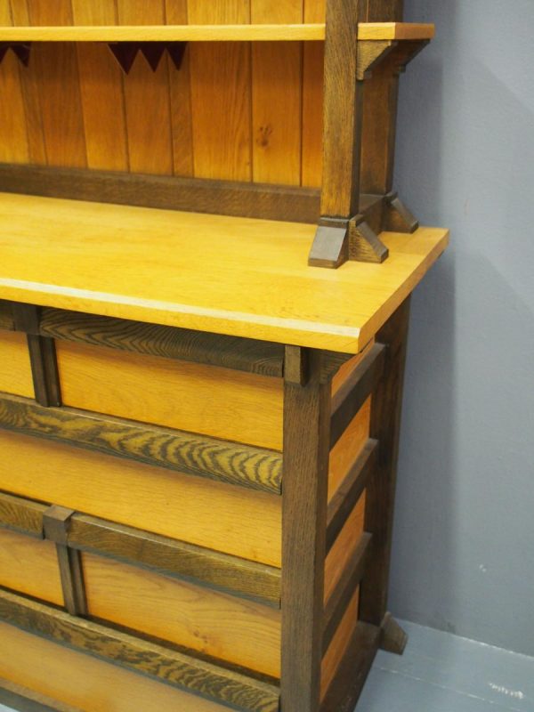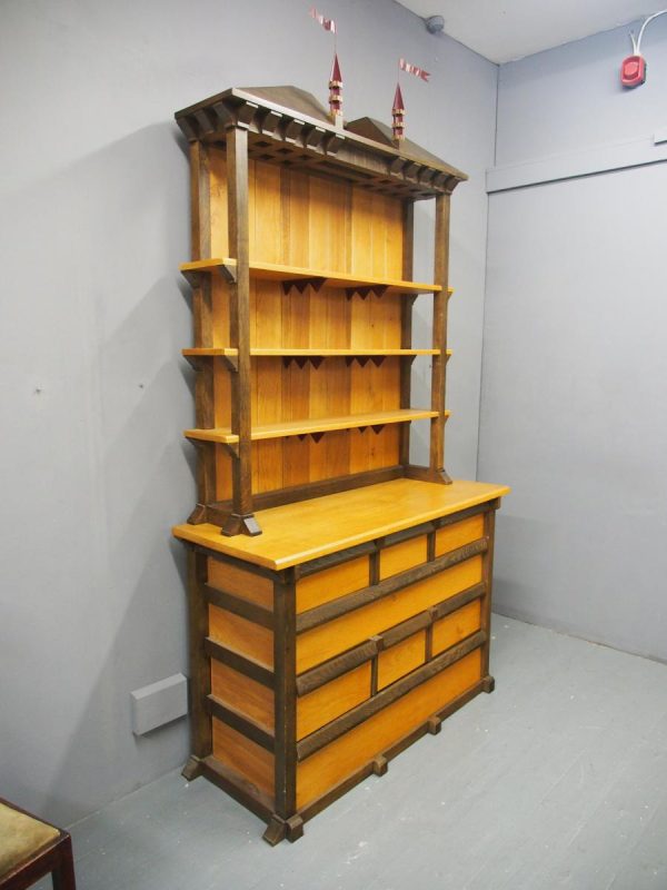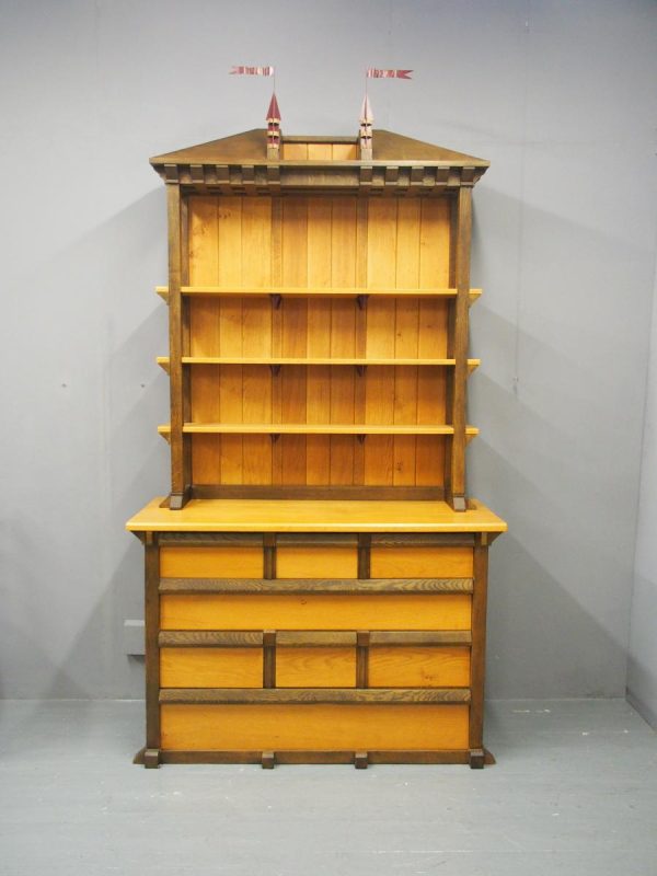 Circa 1990, an unusual oak dresser. The cornice with pennant decoration is surmounted by small castellated sections with 2 metal flags. Beneath this are 3 open shelves, held in place by metal brackets. To the base is a large flat surface and beneath is an arrangement of 8 drawers, all standing on an unusual plinth base.
