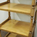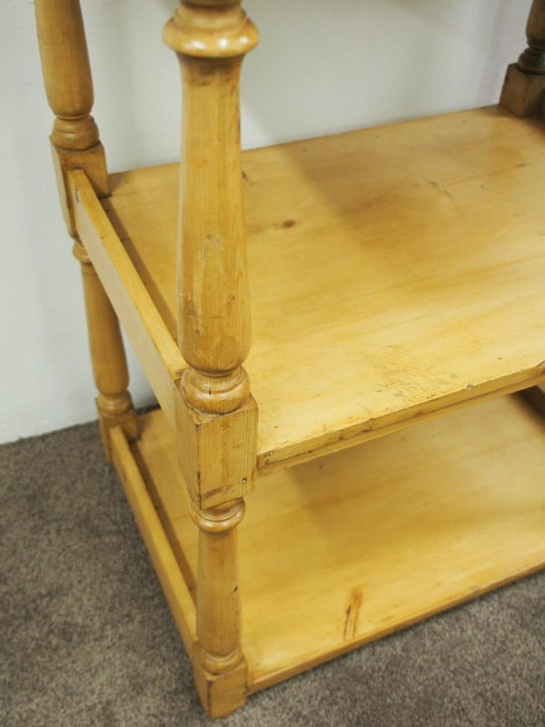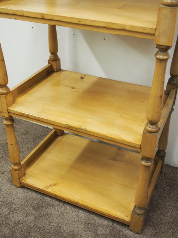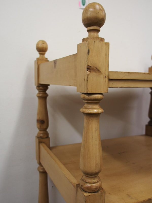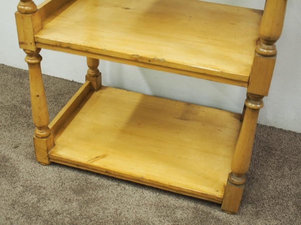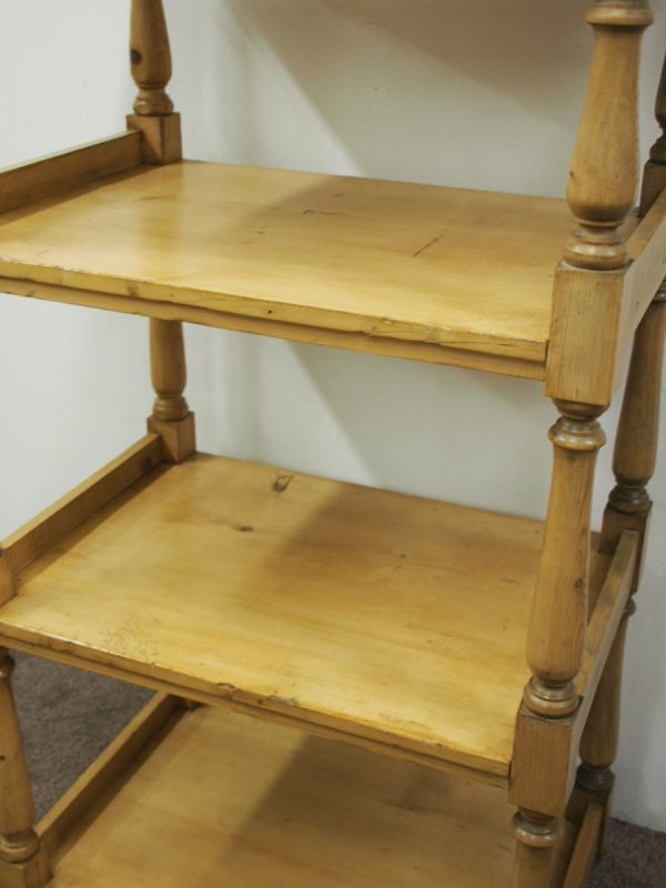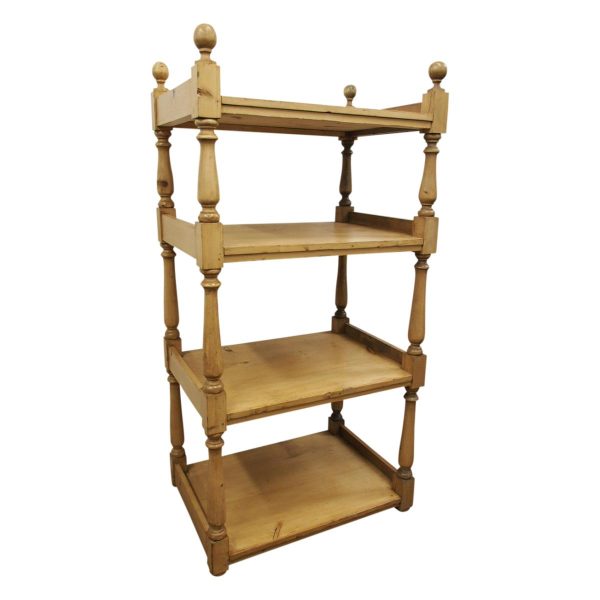 Circa 1880, unusually large yellow pine Victorian whatnot. The four tiers have turned baluster supports and are surmounted by ball finials and side galleries. Could be used as an interesting shop fitting.