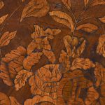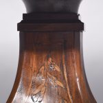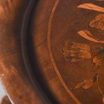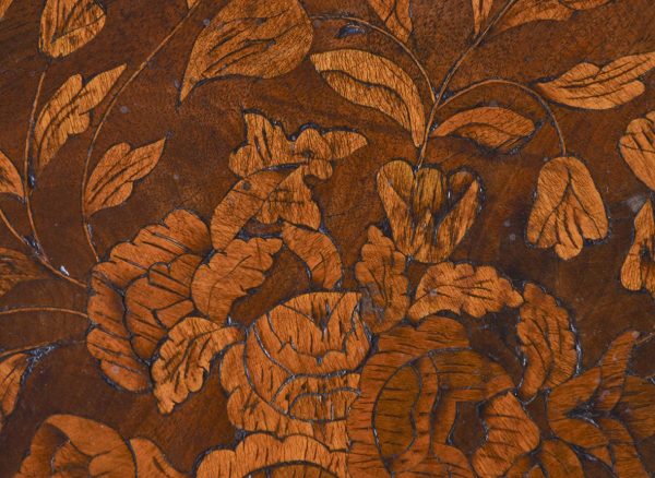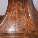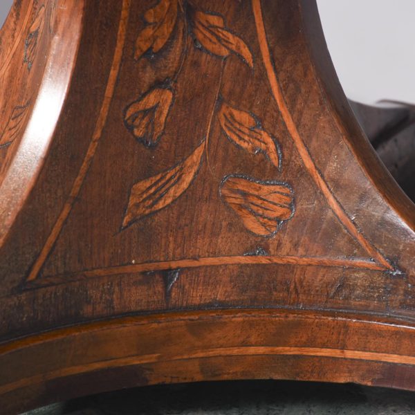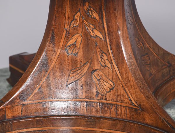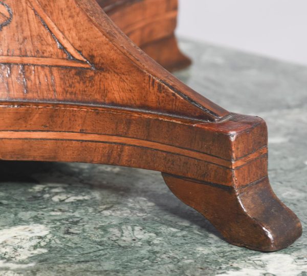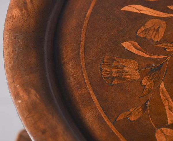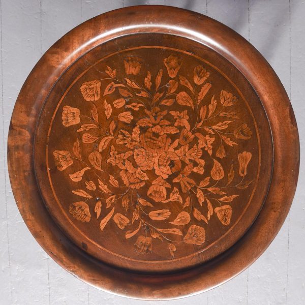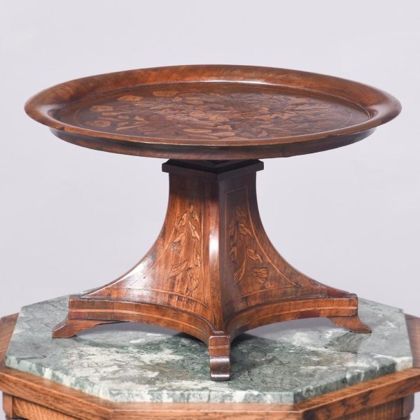 Circa 1880, unusual, miniature Dutch walnut circular breakfast table, the top with a dished edge and large central marquetry panel, standing on an unusual tetrahedron (four-sided pyramid) concave marquetry inlaid base; finishing on four shaped feet.