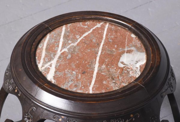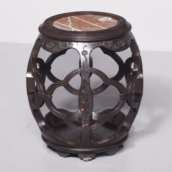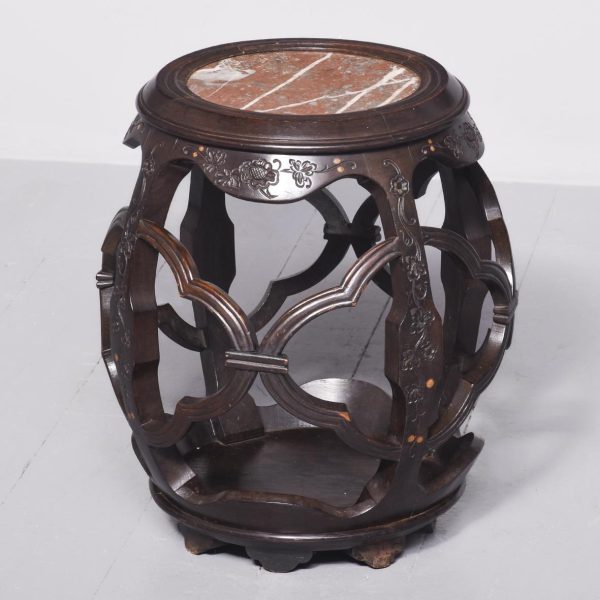 Circa 1880. Unusual Qing period, Chinese hardwood pierced-barrel marble top plantstand. The inset veined rouge marble top within a fluted frame and supported on a pierced shaped supports with foliate and flower head carvings, all over small shaped feet.