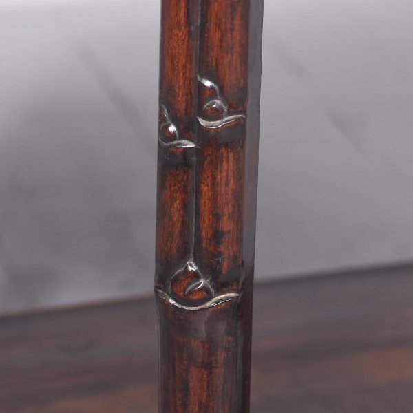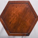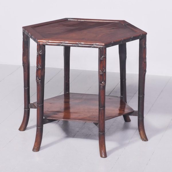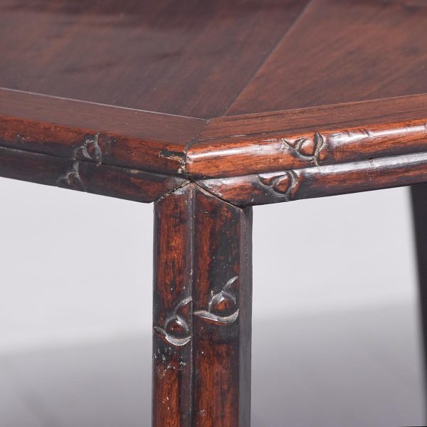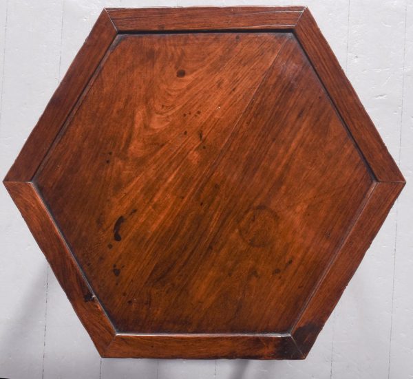 Circa 1900. Unusual Qing period Chinese hexagonal Hongmu occasional table. The inset top in nicely figured hardwood, elevated sides with ribbed foliate carving fore-edges. Supported on faux bamboo legs supporting a neat under-tier.