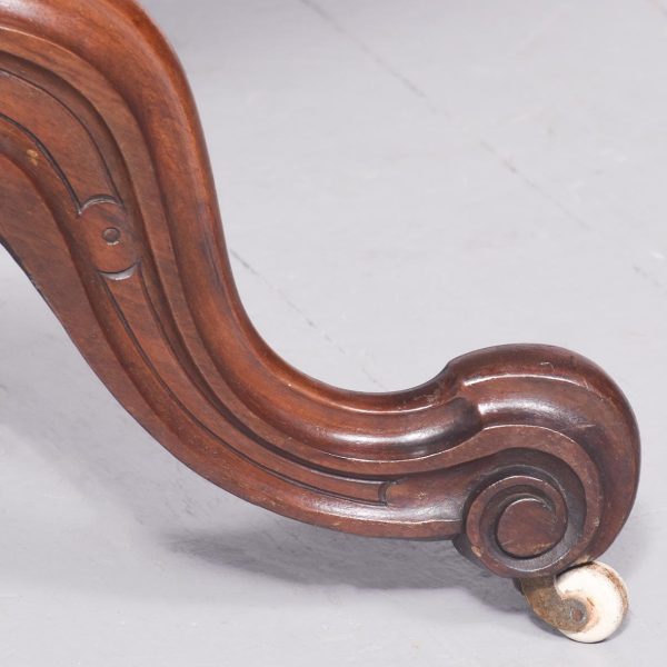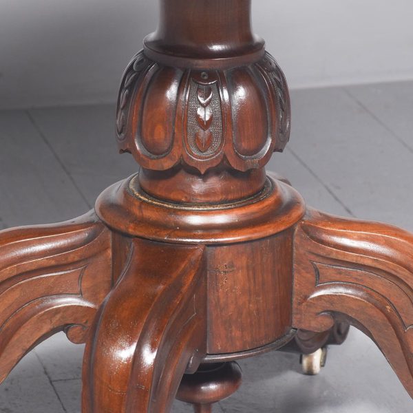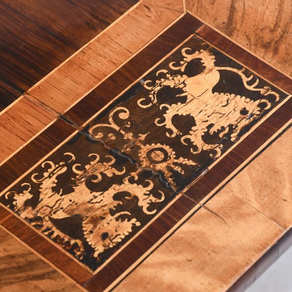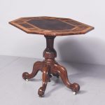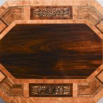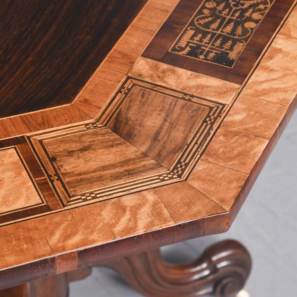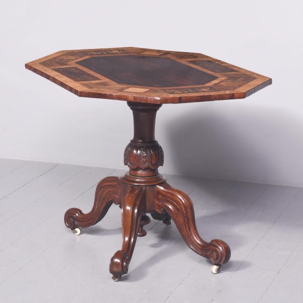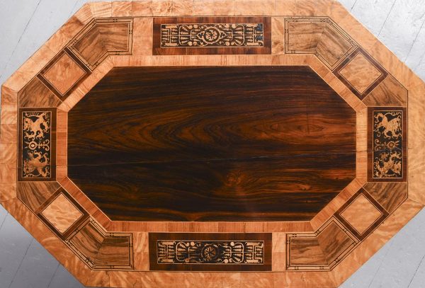 Unusual inlaid rosewood and satinwood centre table. The octagonal top with specimen wood inlays and intricate parquetry decoration and with satinwood, kingwood and boxwood banding and moulded fore edges supported on a carved circular stem over four cabriole legs with scrolled toes over white porcelain and brass castors. Nice colour and patina.