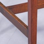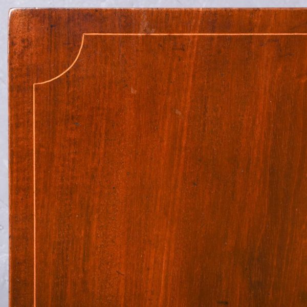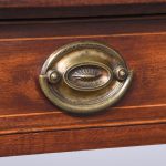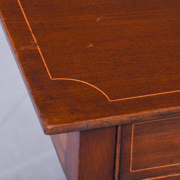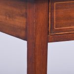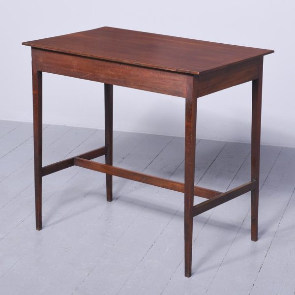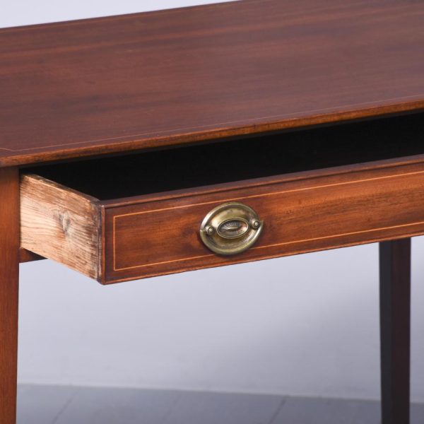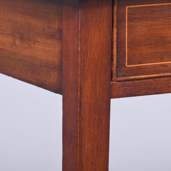 Circa 1780. Unusual style inlaid mahogany George III side table in original condition. The rectangular top in a beautiful Spanish mahogany with boxwood string inlay above a long cock beaded frieze drawer with original oval brass handles and crosscut oak drawer linings. All supported on square and tapering legs with a H stretcher.