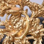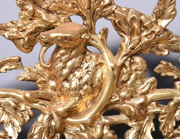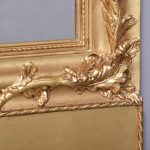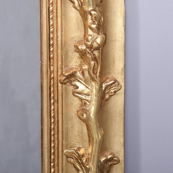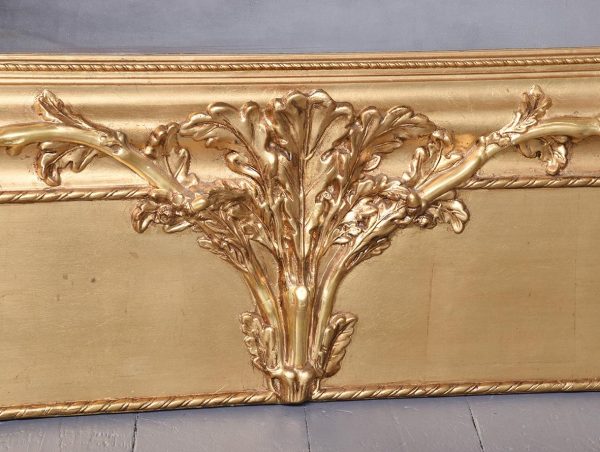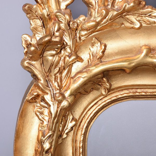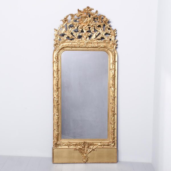 Circa 1890, an unusual Swedish carved gesso and giltwood mirror. At the top there is a large foliate carving with a goat entwined in oak vines. There is a mixture of water leaf and gold leaf gilding and the contrast between them is very stylish. As the pediment continues down it is carved into the sides of the frame, running down both sides and along the base. At the base is a rectangular gilded section with a simple beading on the edge. The mirror retains its original glass.