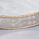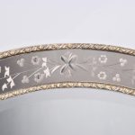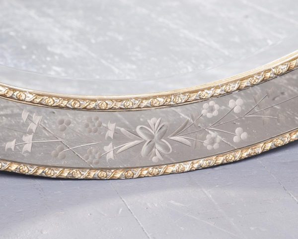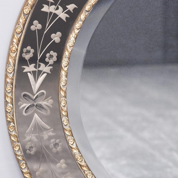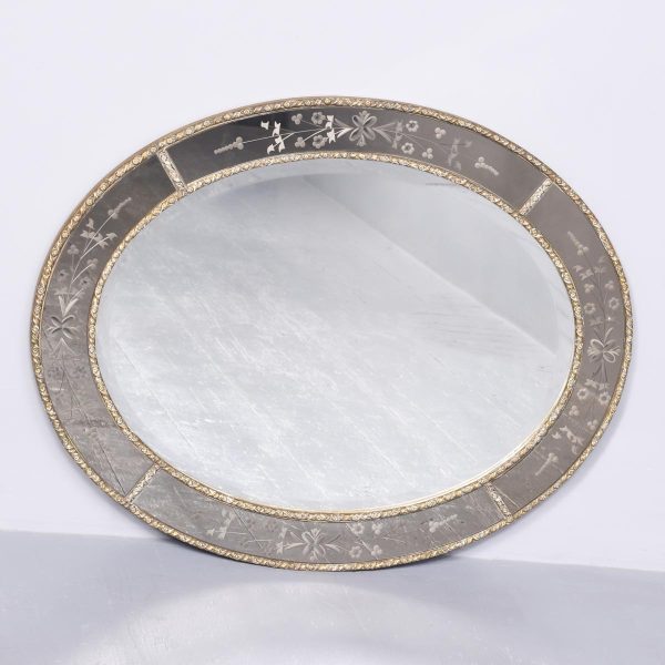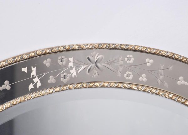 Circa 1930s. An oval shaped venetian style five glass mirror. The central mirror with bevel edge held in place by a gilded and carved gesso slip, with four mirrors to the outside, these are etched from behind, and held in place by similar carved gesso beading, the mirror can be hung either as a portrait or landscape.