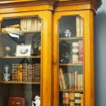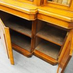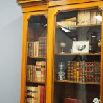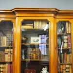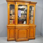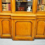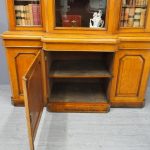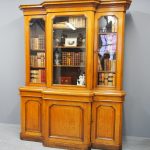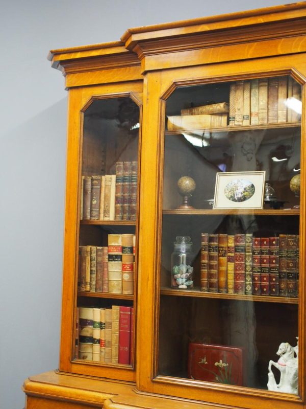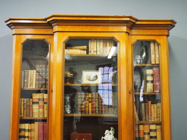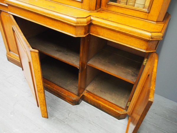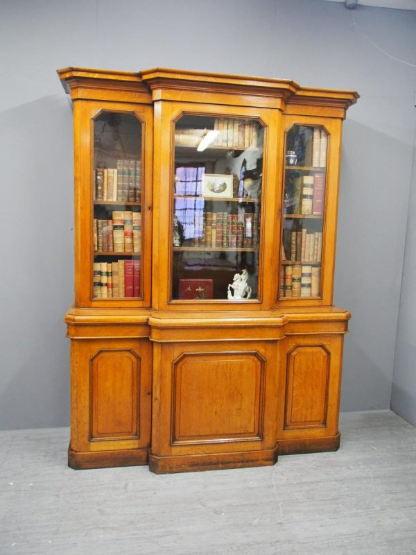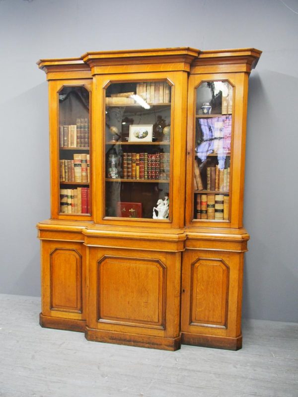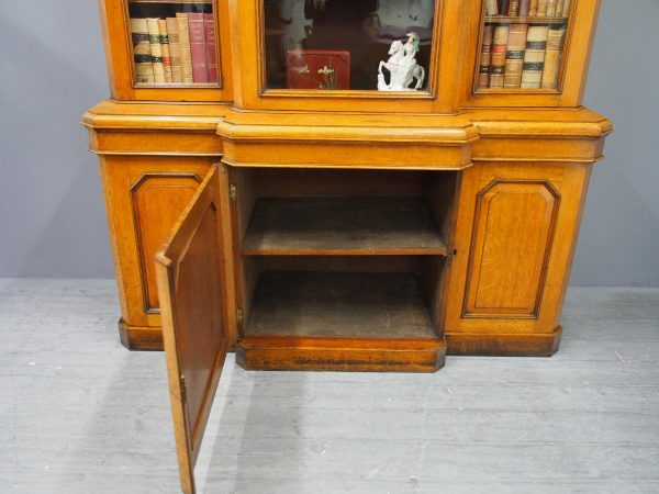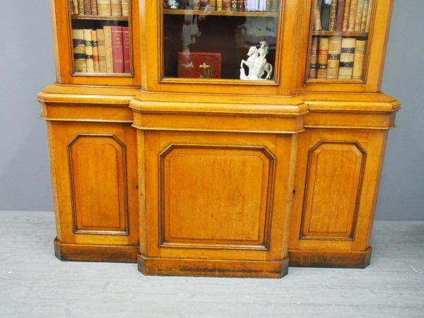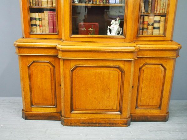 Circa 1860, mid-Victorian 3-door breakfront bookcase in figured quarter-cut, golden oak. The moulded cornice is over a figured oak frieze and 3 glazed doors with chamfered sides, opening to interiors with oak-faced adjustable shelves. The conforming base has a moulded fore-edge over 3 cupboards with fielded panelled doors and shelved interiors, all on an enclosed plinth base.