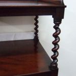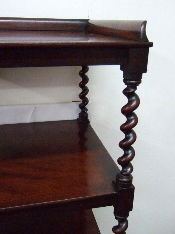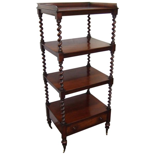 Circa 1860, Victorian 4 tier mahogany whatnot with solid gallery, barley twist columns and single drawer to base.
