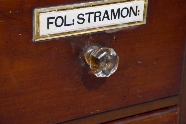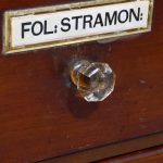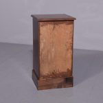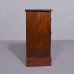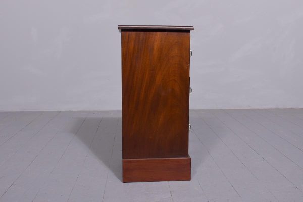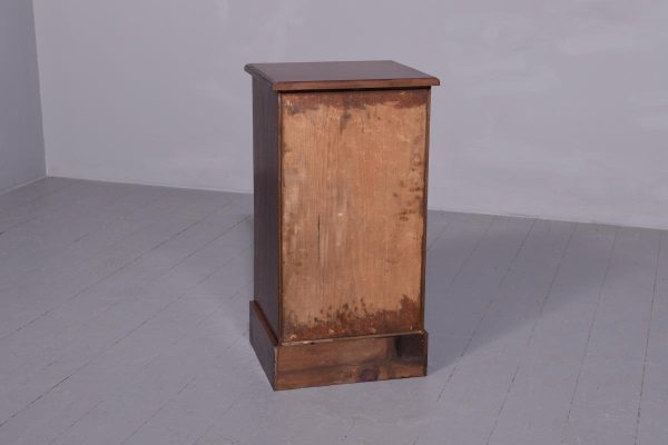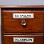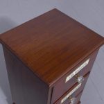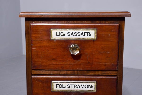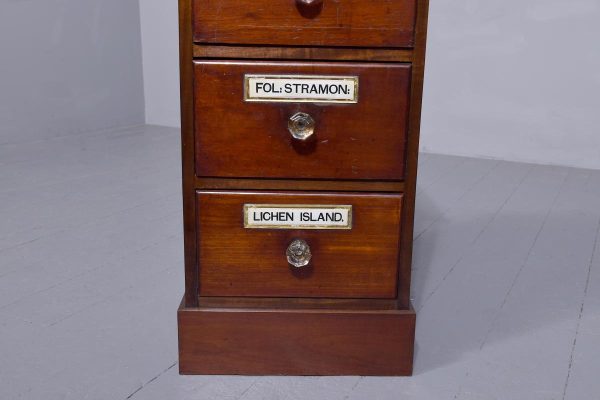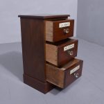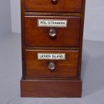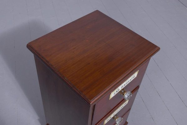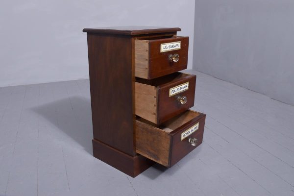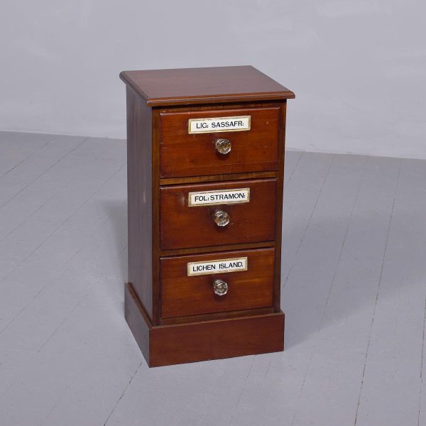 Circa 1860 (with restorations). Victorian apothecary neat neat-sized mahogany chest of drawers/lampstand. The polished rectangular top with moulded edges above three drawers with original apothecary labels and glass handles. All standing on an enclosed plinth base. Traditionally hand restored and in excellent condition.