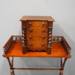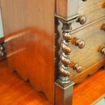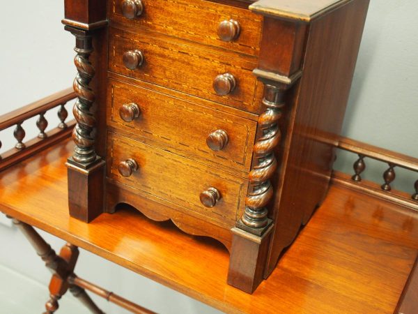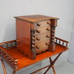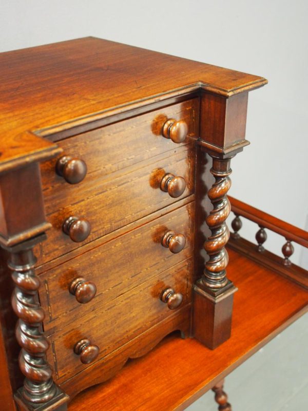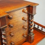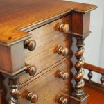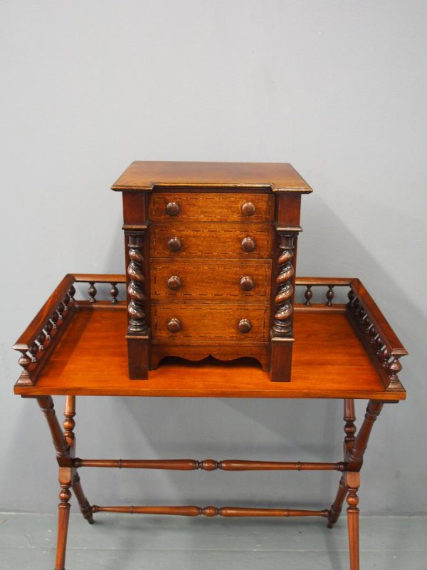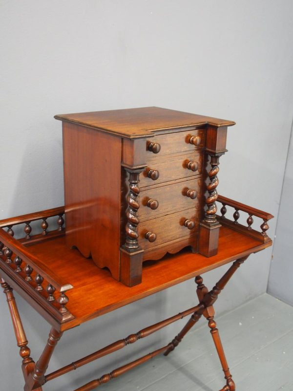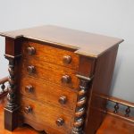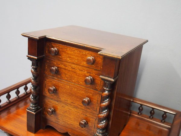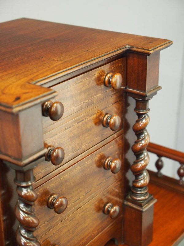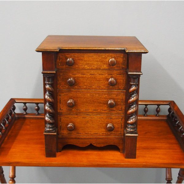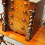 Circa 1860, Victorian apprentice piece or collector’s cabinet in the form of a small Scottish column chest. The reverse breakfront top in figured Spanish mahogany above four chequered-inlaid, mahogany-lined, graduated drawers with twin turned knobs above a shaped skirt and flanked by barley twist columns above square supports.