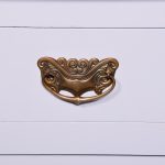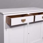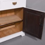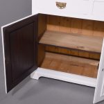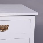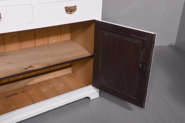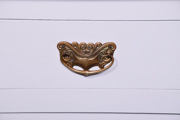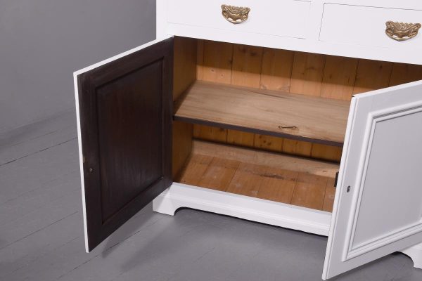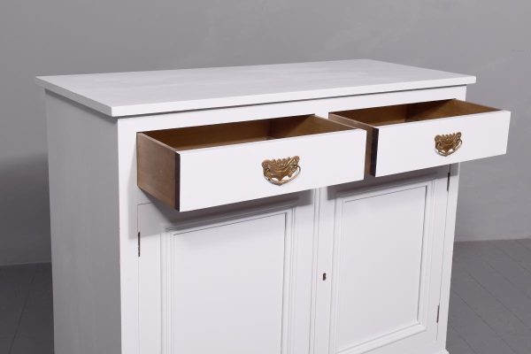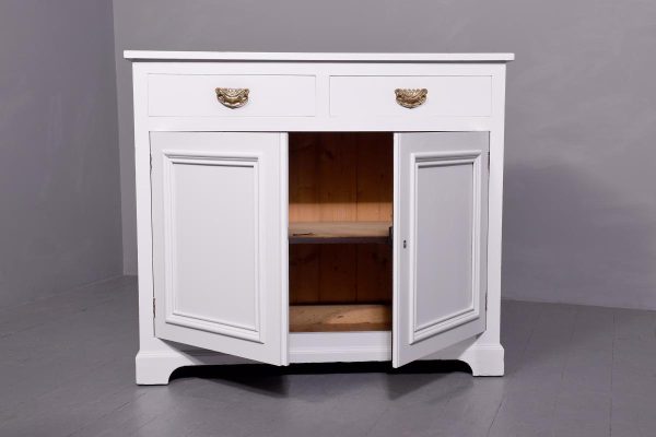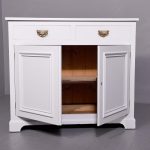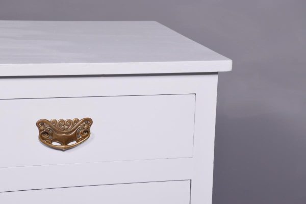 Circa 1880 with later decoration. Victorian Ash Cupboard Redecorated by Hand in a Swedish GreyColour. The solid top above two drawers with decorative Art Nouveau brass handles above a two-door cupboard with moulded panels opening to a fixed shelf interior. All on a moulded base with neat bracket feet.