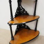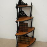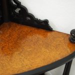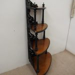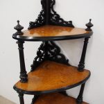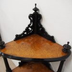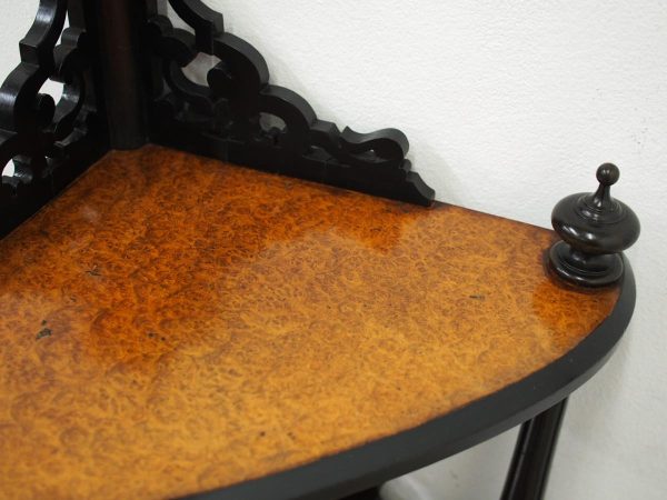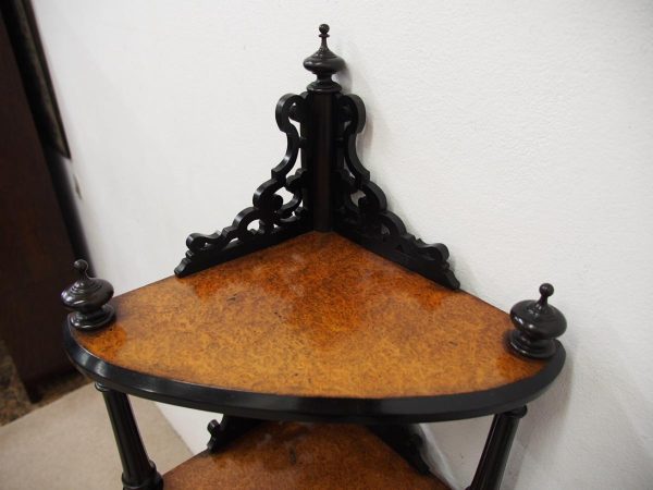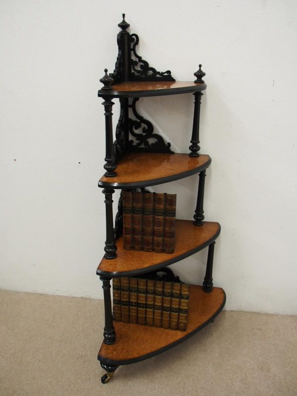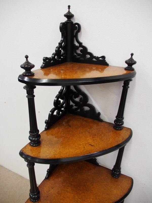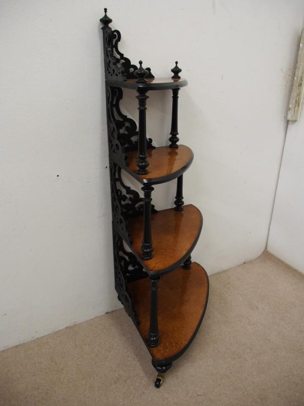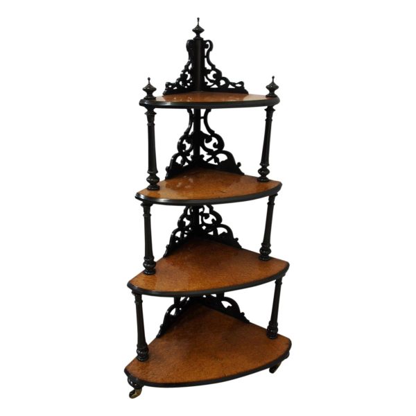 Circa 1870, Victorian four tier corner whatnot in birds eye maple and ebony. The four graduated bow front shelves are supported by fluted and turned ebony uprights, capped by finials. It is all standing on turned bun feet with brass castors. The back features elaborate, opened foliate fretwork.