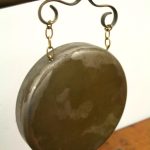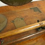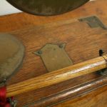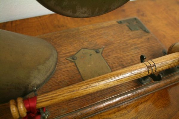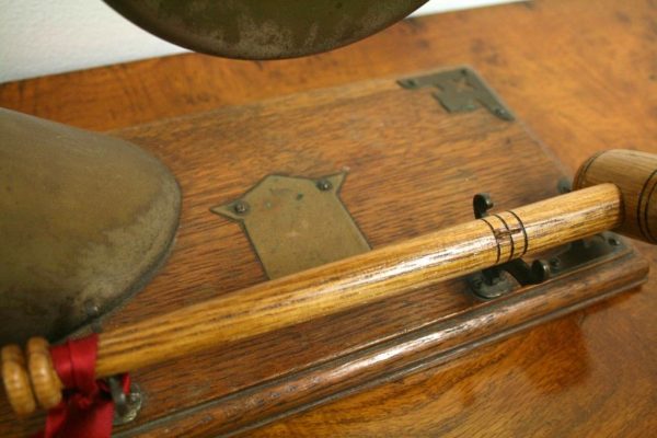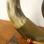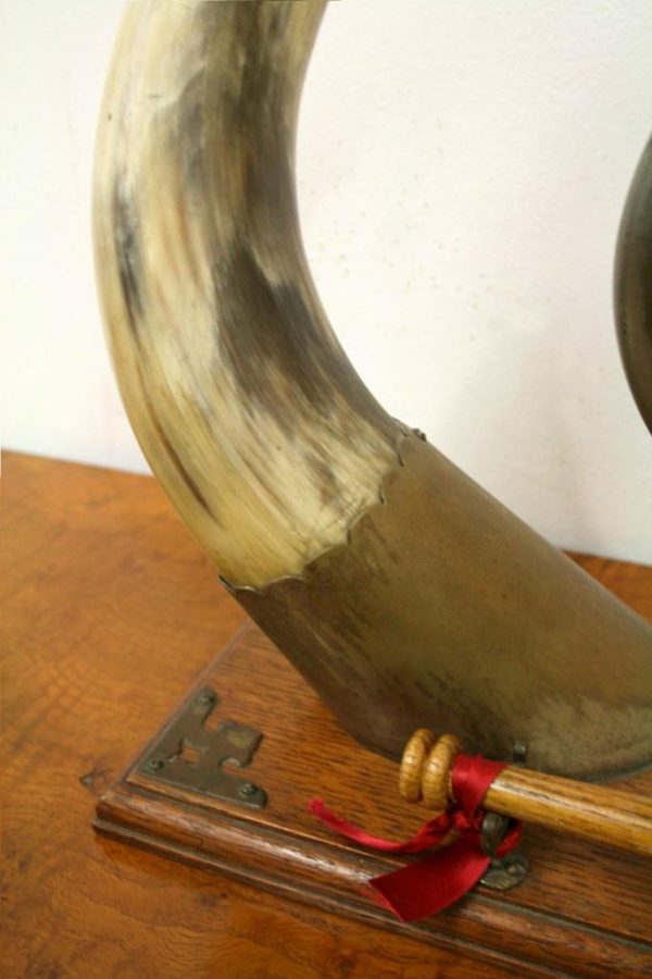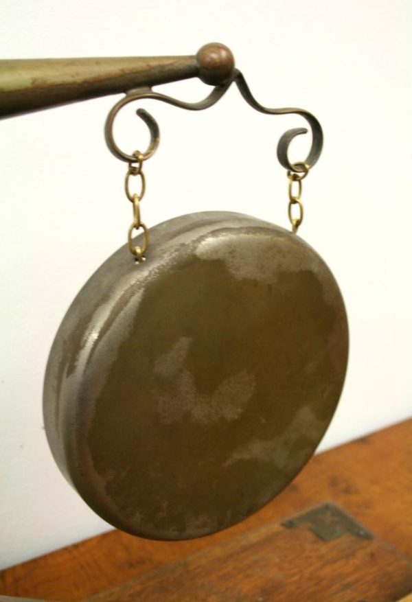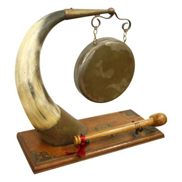 Circa 1890, very unusual and stylish Victorian bovine and steel table top dinner gong. The circular gong has small chains attached to a metal finial which is encased into a curved cow horn. The base of the horn again is encased in metal with its stylish top. The whole piece is fixed to a rectangular oak plinth with ogee moulding and open fretwork brass brackets on 3 corners. There is a small Heraldic style shield in the centre. It has a hallmark with a flag and WH which indicates it has been made by Walker & Hall of Sheffield, one of the top UK companies for Sheffield and EPNS. There are 2 small steel upright arms which hold a small oak beater.