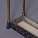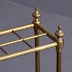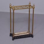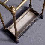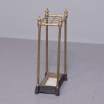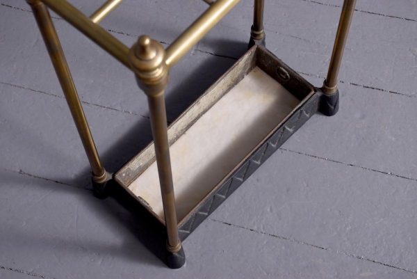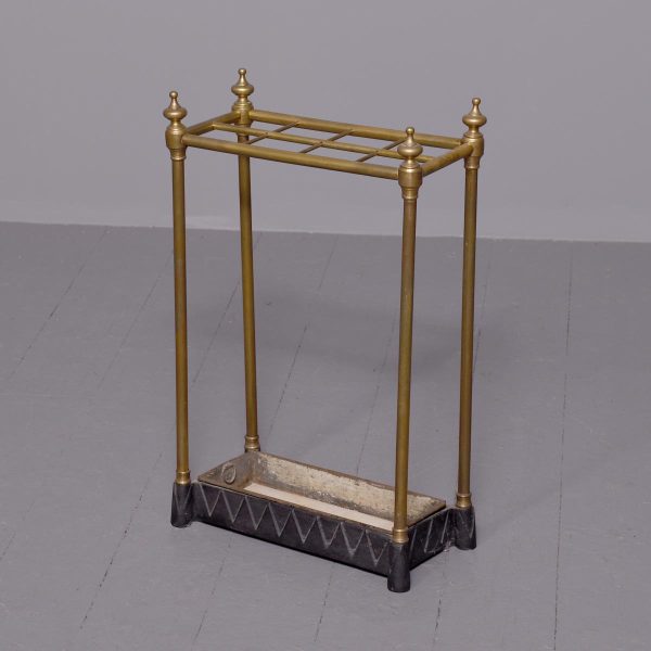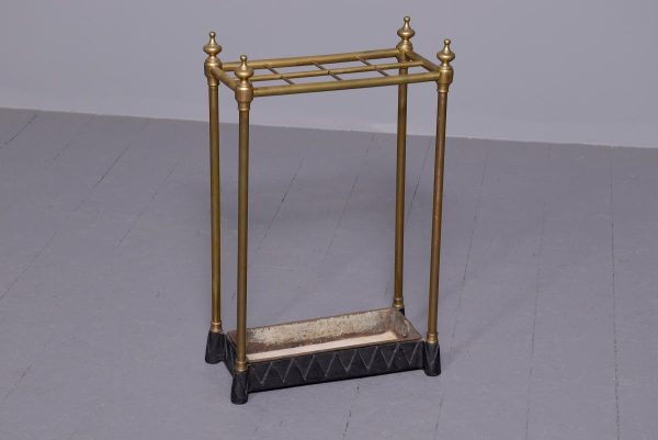 Circa 1880, a neat sized Victorian brass and cast-iron stick stand, the rectangular top with 8 divisions, with each of the corners surmounted with the cast brass finials, the divisions in various gauges of brass, all supported on 4 brass uprights with brass collars to the base, all sitting on a patterned, flared cast iron base, with a lift out drip tray.