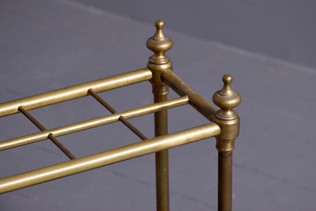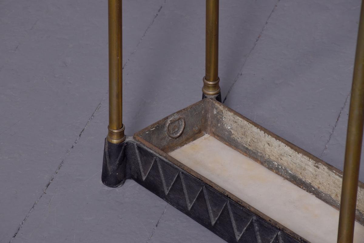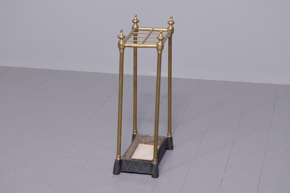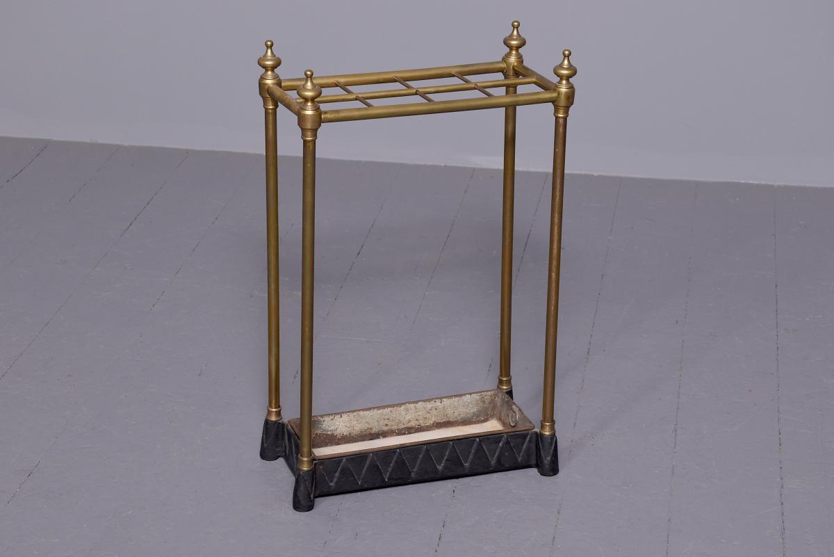 Circa 1880, a neat sized Victorian brass and cast-iron stick stand, the rectangular top with 8 divisions, with each of the corners surmounted with the cast brass finials, the divisions in various gauges of brass, all supported on 4 brass uprights with brass collars to the base, all sitting on a patterned, flared cast iron base, with a lift out drip tray.
