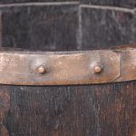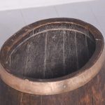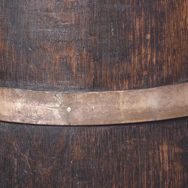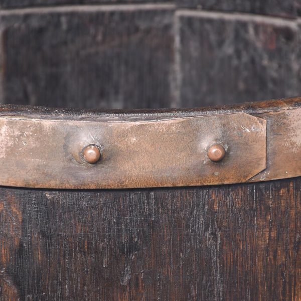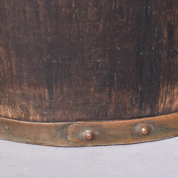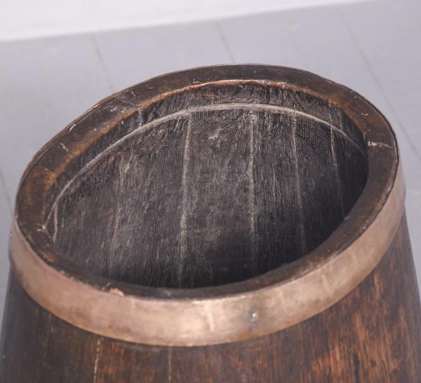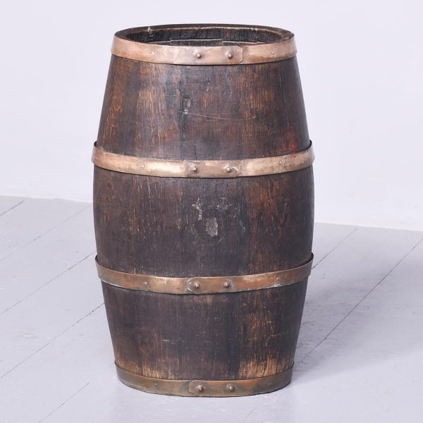 Circa 1880. Victorian brass-bound staved oak sherry cask converted to a stick stand. Made of nicely figured quarter oak with four brass bands with copper rivets. Nice colour and patina.