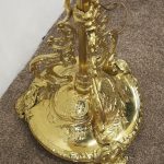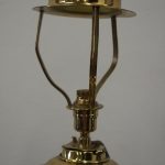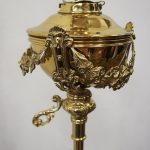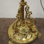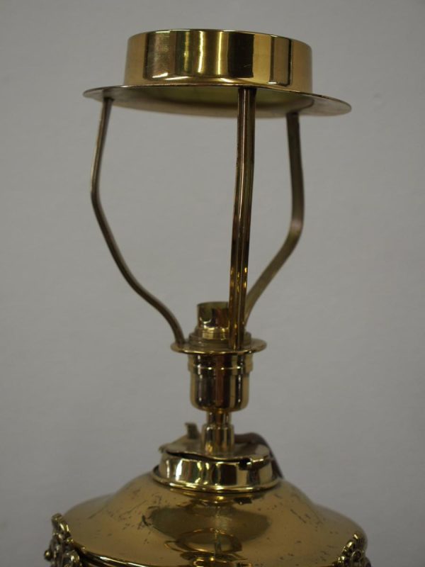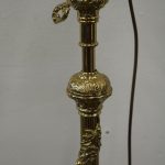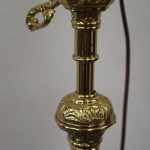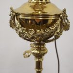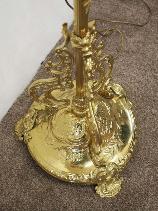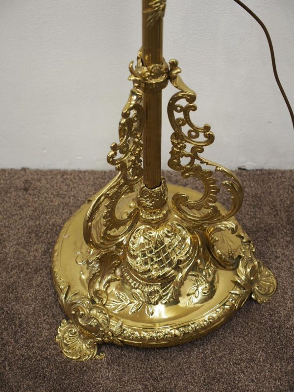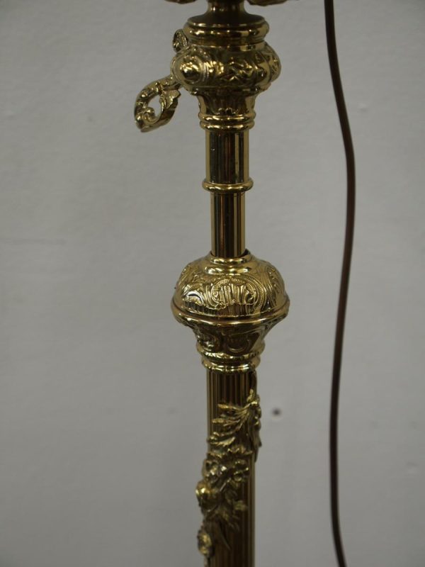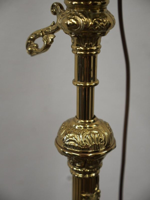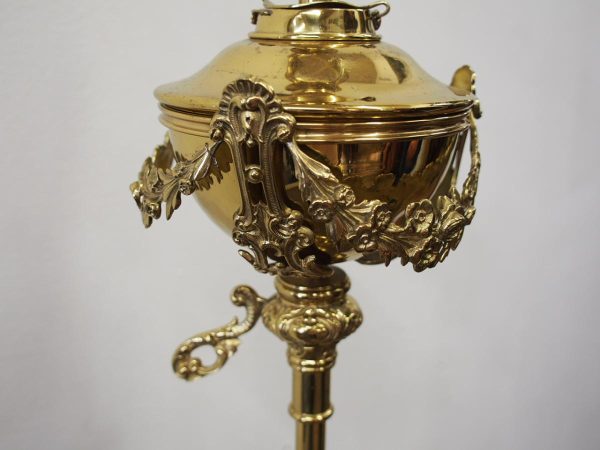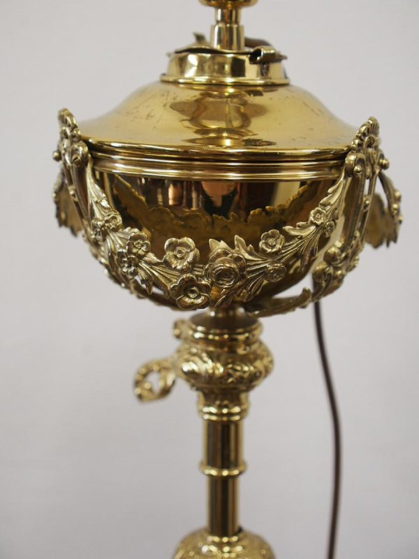Circa 1870, Victorian brass oil lamp converted to electricity. The reservoir sits in a cradle of swags and tails on 3 shaped brackets, leading on to a fluted column with foliate casting. There is a central telescopic arm and the base is domed and embossed with floral patterns. All on Rococo cast brass feet.