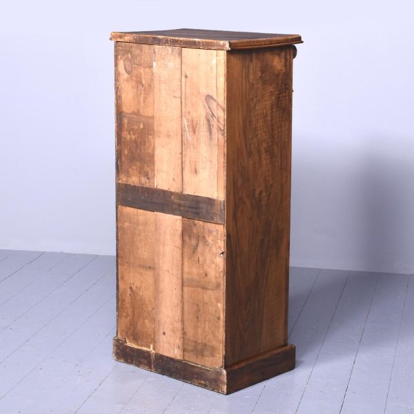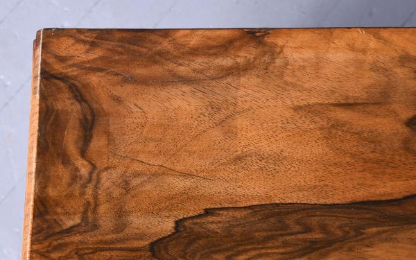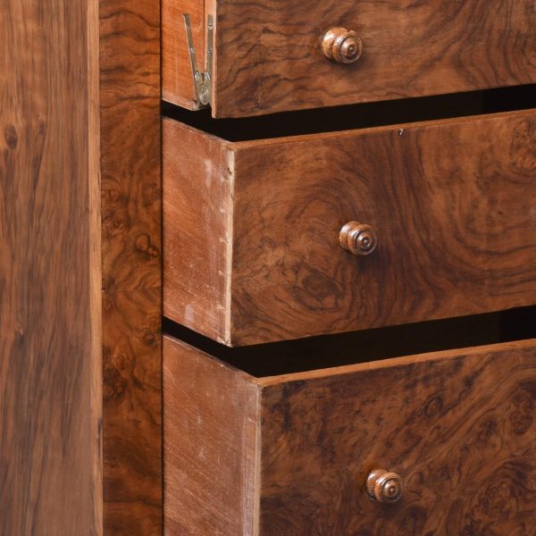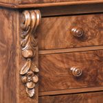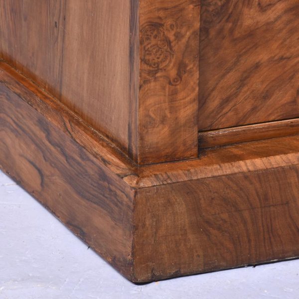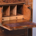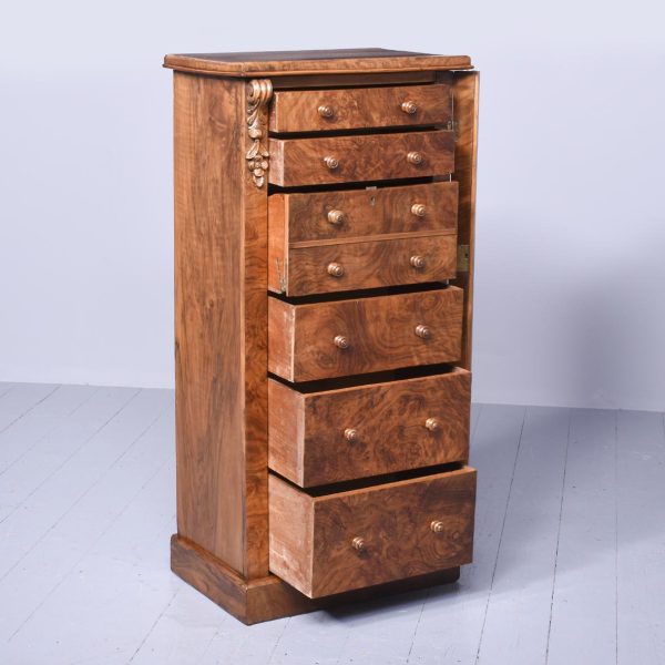 Circa 1870. Victorian burr walnut Wellington secretaire chest. The polished top in figured walnut with canted and beaded fore-edges above the chest with pilasters with carved corbels, the right one a locking pilaster. The top two drawers with original turned knobs and mahogany drawer linings (a sign of quality). Beneath are two faux drawers with a drop down front revealing interior with leather writing surface, pigeon holes and drawers. Beneath this are three deeper matching drawers, all on an enclosed plinth base. In excellent condition.