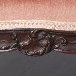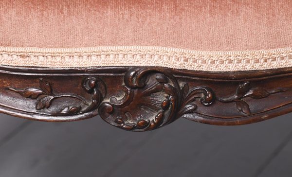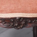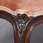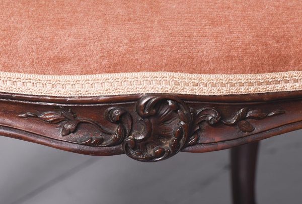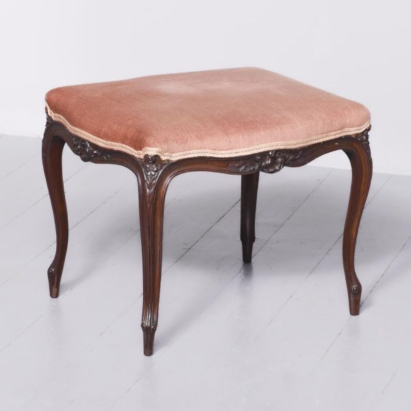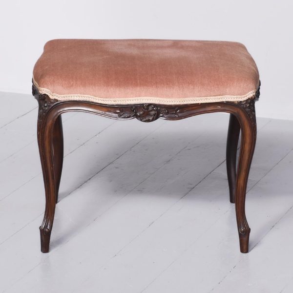 Circa 1880. A late Victorian carved mahogany shaped stool. The upholstered top, held in place by gimp, with a serpentine carved frieze with foliate carving on all sides, all resting on four elegant cabriole legs with foliate carving on the knees, reeding on the facings and sides and finishing on an extended curled foot.