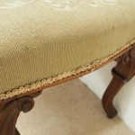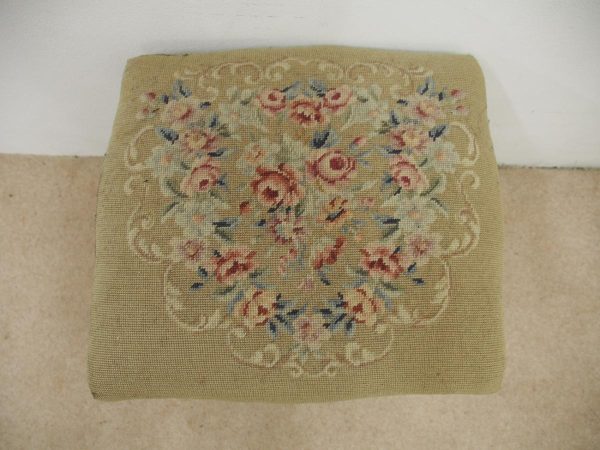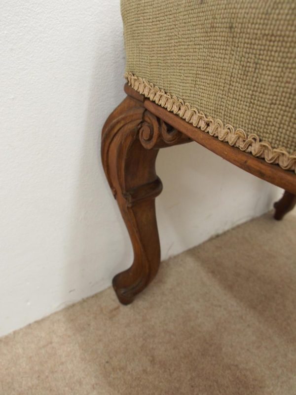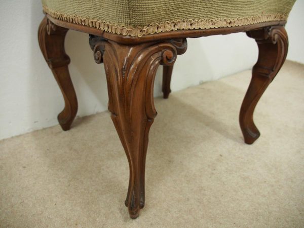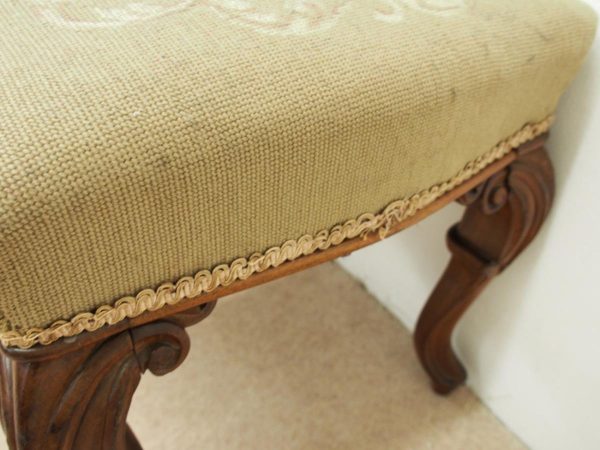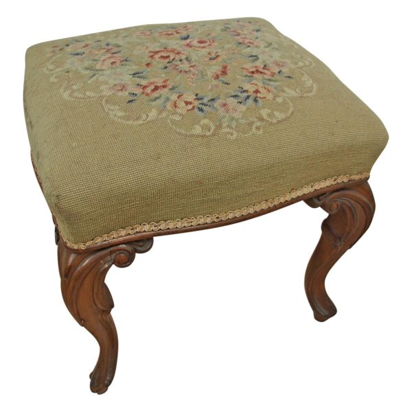 Circa 1880, Victorian carved walnut cabriole stool. With original hand embroidered gros-point tapestry seat in a floral pattern and a round moulding to the base of the seat. It has foliate carved knees and is in good condition.